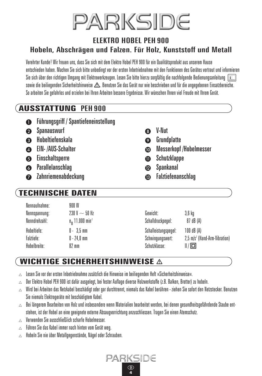 PEH 900 - Elektrohobel PARKSIDE - Kostenlose Bedienungsanleitung