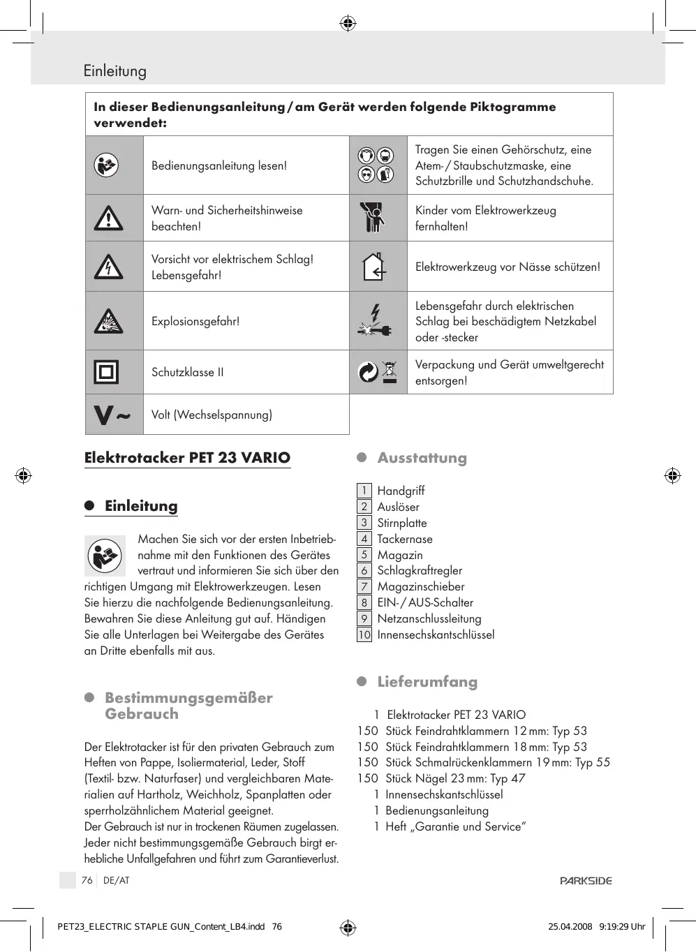 2. Elektrische Sicherheit … .Seite 78 3. Sicherheit von Personen : .Seite 78 4. Verwendung und Behandlung des Elektrowerkzeugs Seite 79 Gerätespezifische Sicherheitshinweise für Elektrotacker Seite 79 Inbetriebnahme , & KIGMMETR / NE SOS 80 & Magazin bestücken.. Seite 81 Ein- und Ausschalten. Seite 81 Schlagkraft einstellen Seite 81 Heften Seite 81 Fehler beheben……………Goite 82 Wartung und Reinigung.….……………….Scic 62 EntsorgUngOeite 82 Informationen Service... .Seite 83 Konformitätserklärung / Herstelle: Seite 83 PARKSIDE DE/AT 75