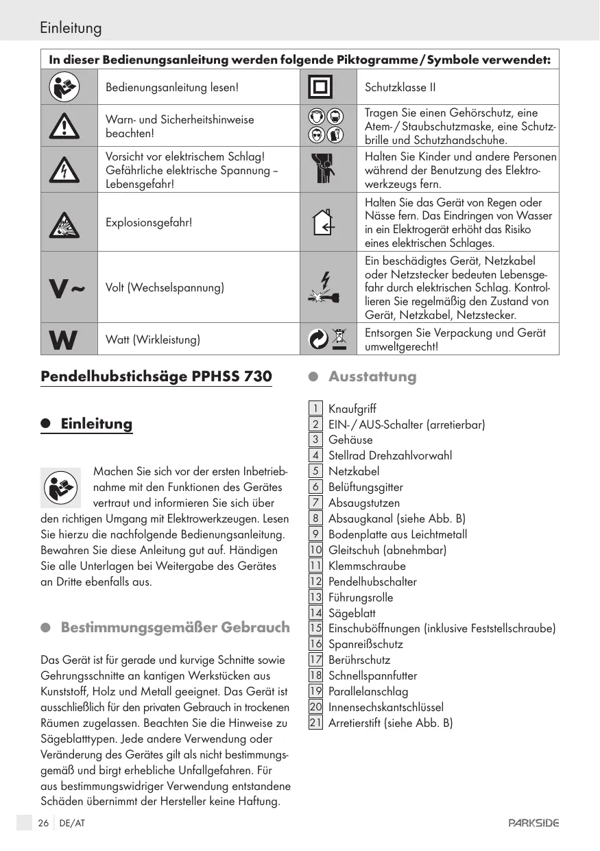 Pendelhubstichsäge PPHSS 730 © Einleitung Machen Sie sich vor der ersten Inbetrieb- nahme mit den Funktionen des Gerätes vertraut und informieren Sie sich über den richtigen Umgang mit Elektrowerkzeugen. Lesen Sie hierzu die nachfolgende Bedienungsanleitung. Bewahren Sie diese Anleitung gut auf. Händigen Sie alle Unterlagen bei Weitergabe des Gerätes an Dritte ebenfalls aus. © BestimmungsgemäBer Gebrauch Das Gerät ist für gerade und kurvige Schnitte sowie Gehrungsschnitte an kantigen Werkstücken aus Kunststoff, Holz und Metall geeignet. Das Gerät ist ausschlieBlich für den privaten Gebrauch in trockenen Räumen zugelassen. Beachten Sie die Hinweise zu Sägeblatttypen. Jede andere Verwendung oder Veränderung des Gerätes gilt als nicht bestimmungs- gemäB und birgt erhebliche Unfallgefahren. Für aus bestimmungswidriger Verwendung entstandene Schäden übernimmt der Hersteller keine Haftung. 26 DE/AT © Ausstattung Knaufgriff EIN-/ AUS-Schalter (arretierbar] Gehäuse Stellrad Drehzahlvorwahl Netzkabel Belüftungsgitter Absaugstutzen Absaugkanal (siehe Abb. B] Bodenplatte aus Leichimetall Gleitschuh (abnehmbar) Klemmschraube Pendelhubschalter Führungsrolle Sägeblatt Einschubëffnungen (inklusive Feststellschraube) SpanreifBschutz Berührschutz Schnellspannfutter Parallelanschlag Innensechskantschlüssel L1] Arretierstift (siehe Abb. B) PARKSIDE