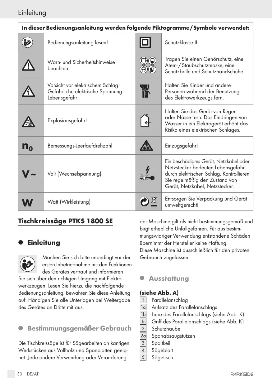 Entsorgen Sie Verpackung und Gerät umweligerechtl (DES Tischkreissäge PTKS 1800 SE © Einleitung Machen Sie sich bitte unbedingt vor der ersten Inbetriebnahme mit den Funktionen des Gerätes vertraut und informieren Sie sich über den richtigen Umgang mit Elektro- werkzeugen. Lesen Sie hierzu die nachfolgende Bedienungsanleitung. Bewahren Sie diese Anleitung auf. Händigen Sie alle Unterlagen bei Weitergabe des Gerätes an Dritte mit aus. © BestimmungsgemäBer Gebrauch Die Tischkreissäge ist für Sägearbeiten an kantigen Werkstücken aus Vollholz und Spanplatten geeig- net. Jede andere Verwendung oder Veränderung 30 DE/AT der Maschine gilt als nicht bestimmungsgemäB und birgt erhebliche Unfallgefahren. Für aus bestim- mungswidriger Verwendung entstandene Schäden übernimmt der Hersteller keine Haftung. Diese Maschine ist ausschlielich für den privaten Gebrauch zugelassen. © Ausstattung iehe Abb. A) Parallelanschlag Aufsatz des Parallelanschlags Lupe des Parallelanschlags [siehe Abb. K] Griff des Parallelanschlags (siehe Abb. K) Schutzhaube Spanabsaugstutzen Spalikeil Sägeblatt Sägetisch PARKSIDE