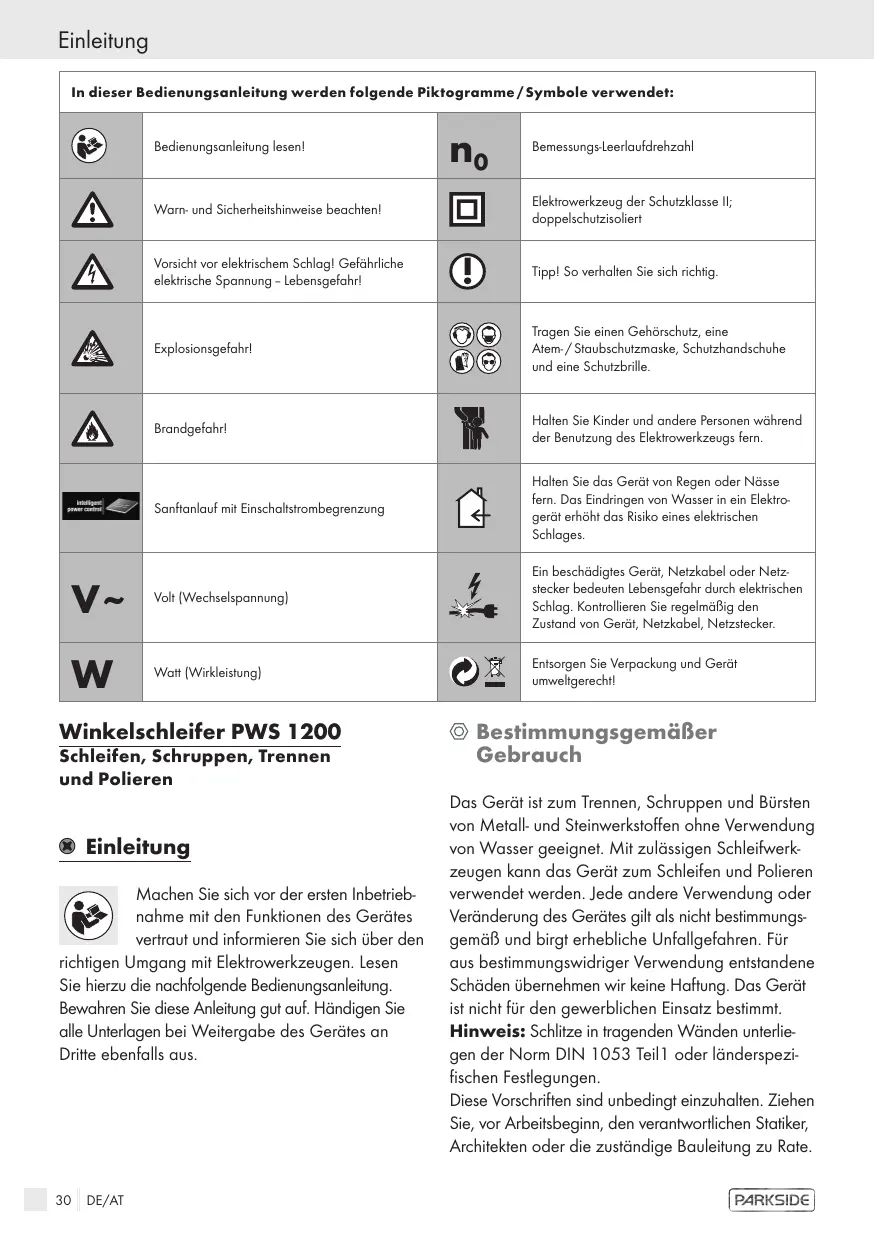 Enisorgen Sie Verpackung und Gerët umvweligerechtl Winkelschleifer PWS 1200 Schleifen, Schruppen, Trennen und Polieren ® Einleitung Machen Sie sich vor der ersten Inbetrieb- nahme mit den Funktionen des Gerätes vertraut und informieren Sie sich über den richtigen Umgang mit Elektrowerkzeugen. Lesen Sie hierzu die nachfolgende Bedienungsanleitung, Bewahren Sie diese Anleitung gut auf. Händigen Sie alle Unterlagen bei Weitergabe des Gerätes an Dritte ebenfalls aus. 30 DE/AT © BestimmungsgemäBer Gebrauch Das Gerät ist zum Trennen, Schruppen und Bürsten von Metall- und Steinwerkstoffen ohne Verwendung von Wasser geeignet. Mit zulässigen Schleifwerk- zeugen kann das Gerät zum Schleifen und Polieren verwendet werden. Jede andere Verwendung oder Veränderung des Gerätes gilt als nicht bestimmungs- gemäB und birgt erhebliche Unfallgefahren. Für aus bestimmungswidriger Verwendung entstandene Schäden überehmen wir keine Haftung. Das Gerët ist nicht für den gewerblichen Einsatz bestimmt. Hinweis: Schlitze in tragenden Wänden unterlie- gen der Norm DIN 1053 Teil oder länderspezi- fischen Festlegungen. Diese Vorschriften sind unbedingt einzuhalten. Ziehen Sie, vor Arbeitsbeginn, den verantworilichen Statiker, Architekten oder die zuständige Bauleitung zu Rate. (FARGDE)