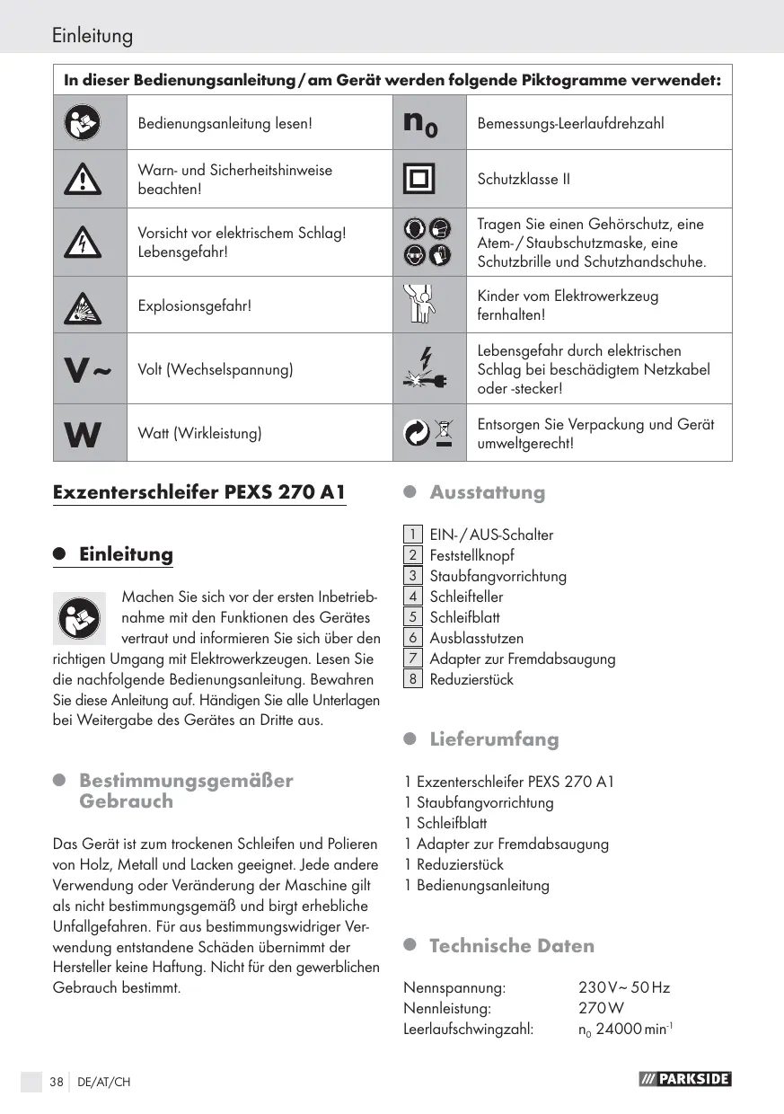 BEDIENUNGSANLEITUNG PEXS 270 A1 RANDOM ORBITAL SANDER PARKSIDE