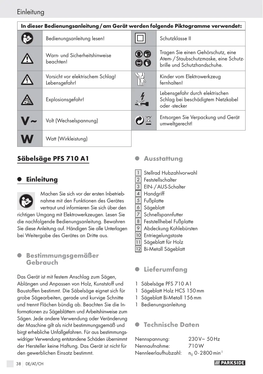 BEDIENUNGSANLEITUNG PFS 710 A1 SABRE SAW PARKSIDE