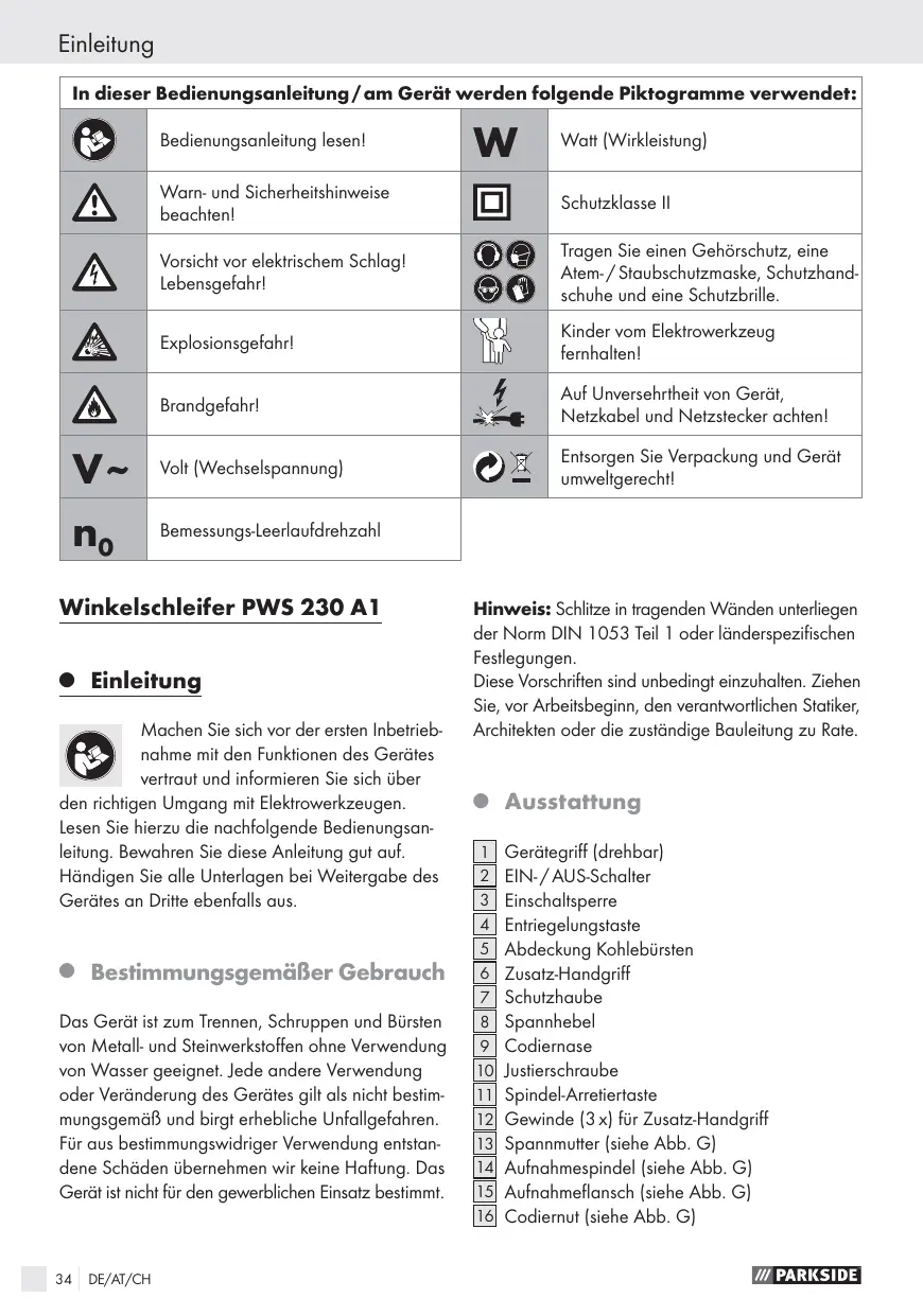 Allgemeine Sicherheitshinweise für Elektrowerkzeuge 1. Arbeitsplatz-Sicherheit Seite 2. Elektrische Sicherheit Seite 3. Sicherheit von Personen Seite 4. Verwendung und Behandlung des ElektrowerkzeugsSeite Sicherheitshinweise für alle Anwendungen Seite Rückschlag und entsprechende Sicherheitshinweise Seite Besondere Sicherheitshinweise zum Schleifen und Trennschleifen Seite Weitere besondere Sicherheitshinweise zum Trennschleifen Seite Besondere Sicherheitshinweise zum Sandpapierschleifen Seite Besondere Sicherheitshinweise zum Polieren Seite Besondere Sicherheitshinweise zum Arbeiten mit DrahtbürstenSeite Gerätespezifische Sicherheitshinweise für Winkelschleifer Seite Arbeitshinweise Seite
