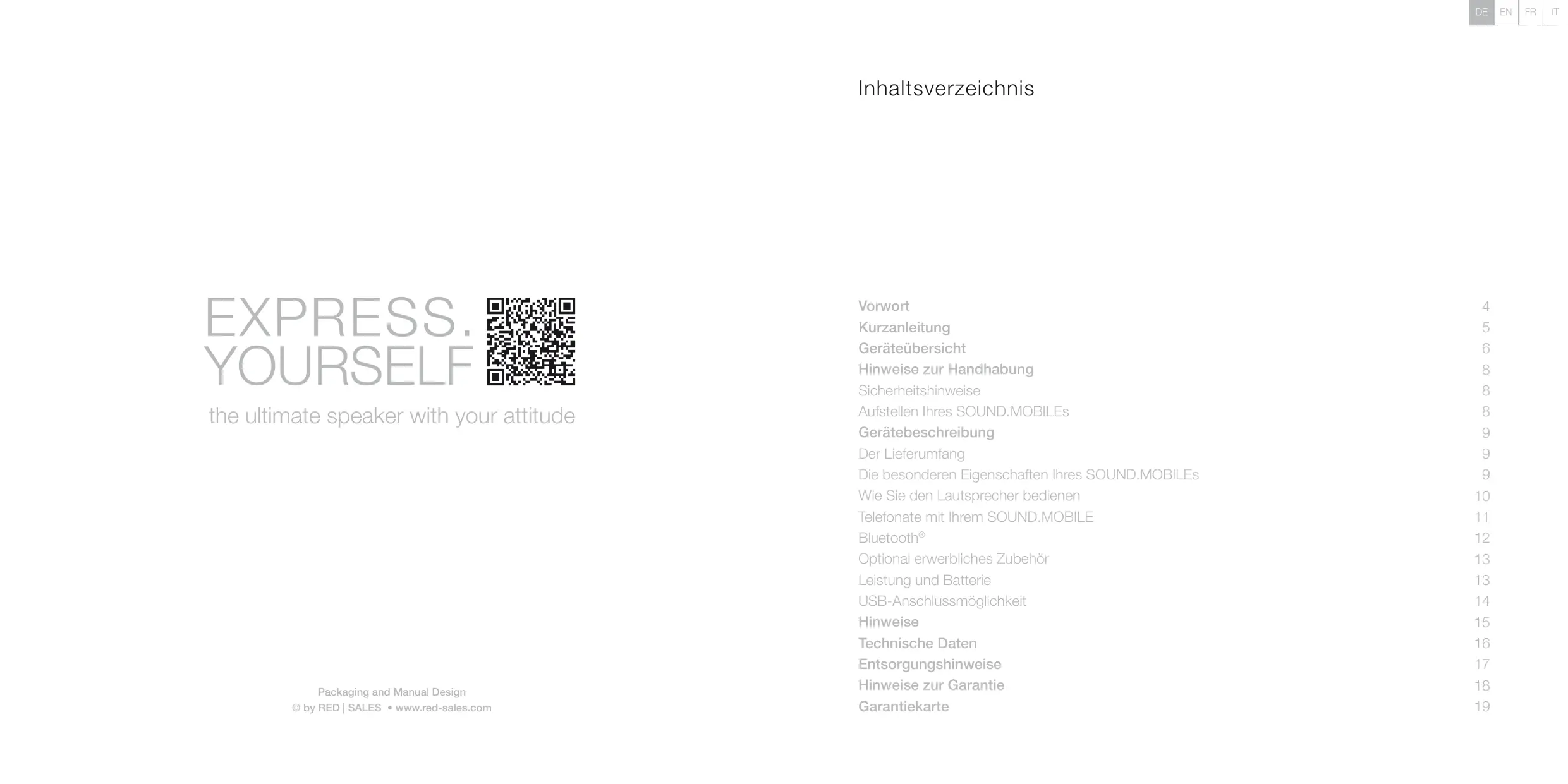 Ihr SOUND.MOBILE bietet Ihnen die ideale Mänglichkeit Ihr Bluetooth®- fahiges Ausgangsgerät anzuschließen und ein goßartiges Sounderlebnis vöglich unabhängig von Kabeln und Netzanschlüssen zu erleben. Eine Ladestandsanzeige an Ihr dem Sound.MOBILE informiert Sie über den aktuellen Ladezustand.