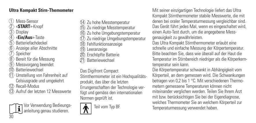 Zu hohe Messtemperatur Zu niedrige Messtemperatur Zu hohe Umgebungstemperatur Zu niedrige Umgebungstemperatur Fehlfunktionsanzeige Leeranzeige Erschöpfte Batterie Batteriewechsel Das Digifront Compact Stirnthermometer ist ein Hochqualitätsprodukt, das über die letzten Errungenschaften der Technologie verfügt und gemäss den internationalen Normen geprüft ist. Teil vom Typ BF. Mit seiner einzigartigen Technologie liefert das Ultra Kompakt Stirnthermometer stabile Messwerte, die mit denen bei oraler Temperaturmessung vergleichbar sind. Das Gerät führt jedes Mal, wenn es eingeschaltet wird, einen Auto-Test durch, um die angegebene Messgenauigkeit zu gewährleisten. Das Ultra Kompakt Stirnthermometer erlaubt eine schnelle und einfache Messung der Körpertemperatur. Bitte beachten Sie, dass wie überall auf der Haut die Temperatur im Stirnbereich niedriger als die Körperkerntemperatur sein kann. Die Körpertemperatur schwankt in Abhängigkeit vom Körperteil, an dem gemessen wird. Die Schwankungen betragen von 0,2 bis 1 °C. Mit verschiedenen Thermometern gemessene Temperaturen können nicht miteinander verglichen werden. Teilen Sie Ihrem Arzt mit bzw. berücksichtigen Sie bei der Eigendiagnose, welches Thermometer Sie an welchem Körperteil zur Temperaturmessung verwendet haben. Ein wichtiger physiologischer Effekt, Vasokonstriktion genannt, kann in den frühen Fieberstadien auftreten. Dabei wirkt die Haut kühl, und die mit einem Stirnthermomete gemessene Temperatur kann u.U. verdächtig niedrig sein. Entspricht der Messwert nicht dem Befinden des Patienten oder ist er verdächtig niedrig, wiederholen Sie die Messung alle 15 Minuten oder überprüfen Sie das Ergebnis mit einer weiteren Messung der Körperkerntemperatur, z.B. mit einem Infrarot-Trommelfellthermometer oder einem rektalen Stabthermometer. Inhaltsverzeichnis: