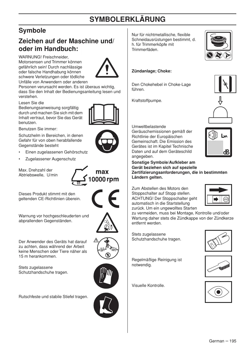 Warnung vor hochgeschleuderten und abprallenden Gegenständen. Stets zugelassene Schutzhandschuhe tragen. Zündanlage; Choke: Den Chokehebel in Choke-Lage führen. Kraftstoffpumpe. Umweltbelastende Geräuschemissionen gemäß der Richtlinie der Europäischen Gemeinschaft. Die Emission des Gerätes ist im Kapitel Technische Daten und auf dem Geräteschild angegeben. Sonstige Symbole/Aufkleber am Gerät beziehen sich auf spezielle Zertifizierungsanforderungen, die in bestimmten Ländern gelten. Zum Abstellen des Motors den Stoppschalter auf Stopp stellen. ACHTUNG! Der Stoppschalter geht automatisch in die Startstellung zurück. Um ein ungewolltes Starten zu vermeiden, muss bei Montage, Kontrolle und/oder Wartung daher stets die Zündkappe von der Zündkerze entfernt werden. Dieses Produkt stimmt mit den geltenden CE-Richtlinien überein. Der Anwender des Geräts hat darauf zu achten, dass während der Arbeit keine Menschen oder Tiere näher als 15 m herankommen. Nur für nichtmetallische, flexible Schneidausrüstungen bestimmt, d. h. für Trimmerköpfe mit Trimmerfäden. Stets zugelassene Schutzhandschuhe tragen. 15 m 50FT 15 m 50FT Regelmäßige Reinigung ist notwendig. Visuelle Kontrolle. Rutschfeste und stabile Stiefel tragen. German – 195 INHALT Inhalt SYMBOLERKLÄRUNG Symbole ................................................................ Zeichen auf der Maschine und/oder im Handbuch: INHALT Inhalt ..................................................................... Vor dem Start ist Folgendes zu beachten: ............ EINLEITUNG Sehr geehrter Kunde! ........................................... WAS IST WAS? Was ist was am Trimmer? ..................................... ALLGEMEINE SICHERHEITSVORSCHRIFTEN Wichtig .................................................................. Persönliche Schutzausrüstung ............................. Sicherheitsausrüstung des Gerätes ...................... Schneidausrüstung ............................................... MONTAGE Montage des Loophandgriffs ................................ Montage und Demontage des zerlegbaren Führungsrohrs ..................................................... Montage der Schneidausrüstung .......................... Montage von Trimmerschutz und Trimmerkopf ..... Montage von Trimmerschutz und Trimmerkopf .....