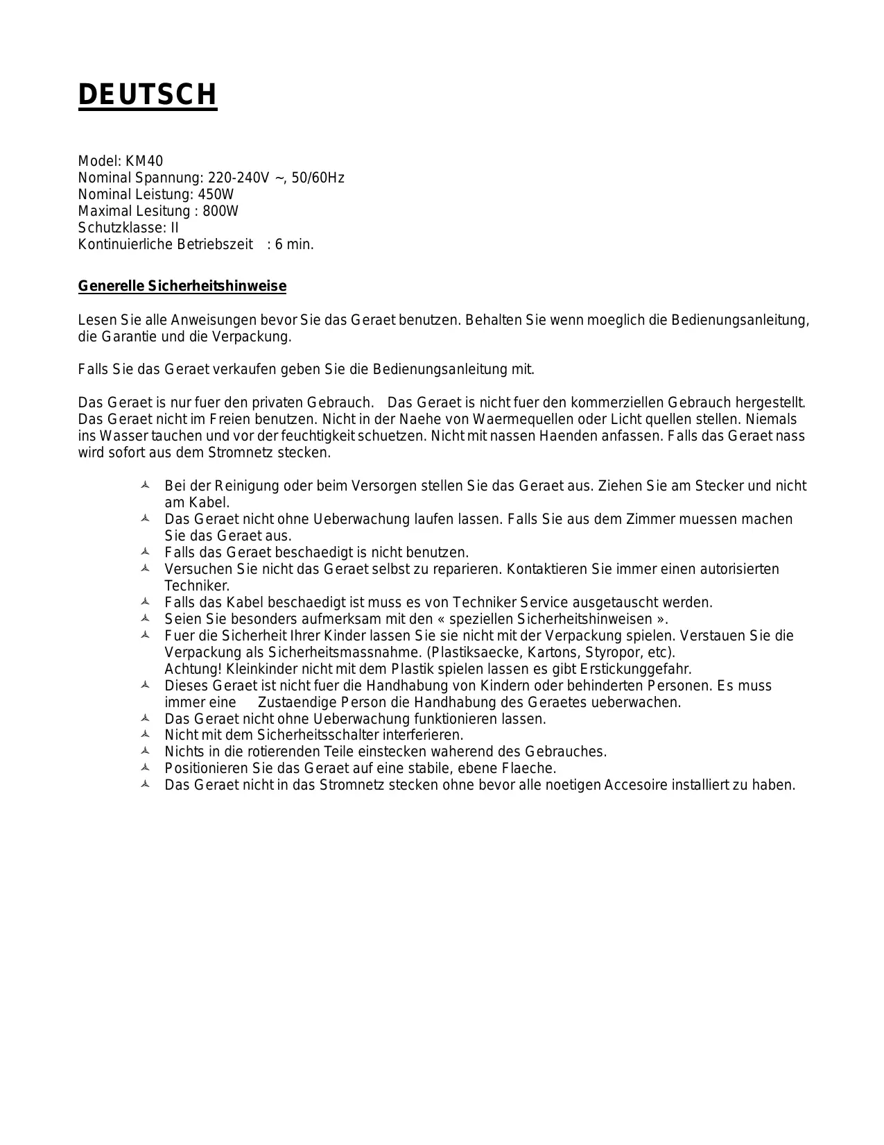 Veillez à ceux que les pièces soient totalement sèches avec de les réutiliser ou de les ranger. Environnement Fabriqué pour et importé par : Adeva European Import 8 rue Marc Seguin 77290 Mitry-Mory FRANCE www.adeva-import.com - contact@adeva-import.com - Tél. 01 64 67 00 01 DEUTSCH Model: KM40 Nominal Spannung: 220-240V ~, 50/60Hz Nominal Leistung: 450W Maximal Lesitung : 800W Schutzklasse: II Kontinuierliche Betriebszeit : 6 min. Generelle Sicherheitshinweise Lesen Sie alle Anweisungen bevor Sie das Geraet benutzen. Behalten Sie wenn moeglich die Bedienungsanleitung, die Garantie und die Verpackung. Falls Sie das Geraet verkaufen geben Sie die Bedienungsanleitung mit. Das Geraet is nur fuer den privaten Gebrauch. Das Geraet is nicht fuer den kommerziellen Gebrauch hergestellt. Das Geraet nicht im Freien benutzen. Nicht in der Naehe von Waermequellen oder Licht quellen stellen. Niemals ins Wasser tauchen und vor der feuchtigkeit schuetzen. Nicht mit nassen Haenden anfassen. Falls das Geraet nass wird sofort aus dem Stromnetz stecken. Bei der Reinigung oder beim Versorgen stellen Sie das Geraet aus. Ziehen Sie am Stecker und nicht am Kabel. Das Geraet nicht ohne Ueberwachung laufen lassen. Falls Sie aus dem Zimmer muessen machen Sie das Geraet aus. Falls das Geraet beschaedigt is nicht benutzen. Versuchen Sie nicht das Geraet selbst zu reparieren. Kontaktieren Sie immer einen autorisierten Techniker. Falls das Kabel beschaedigt ist muss es von Techniker Service ausgetauscht werden. Seien Sie besonders aufmerksam mit den « speziellen Sicherheitshinweisen ». Fuer die Sicherheit Ihrer Kinder lassen Sie sie nicht mit der Verpackung spielen. Verstauen Sie die Verpackung als Sicherheitsmassnahme. (Plastiksaecke, Kartons, Styropor, etc). Achtung! Kleinkinder nicht mit dem Plastik spielen lassen es gibt Erstickunggefahr. Dieses Geraet ist nicht fuer die Handhabung von Kindern oder behinderten Personen. Es muss immer eine Zustaendige Person die Handhabung des Geraetes ueberwachen. Das Geraet nicht ohne Ueberwachung funktionieren lassen. Nicht mit dem Sicherheitsschalter interferieren. Nichts in die rotierenden Teile einstecken waherend des Gebrauches. Positionieren Sie das Geraet auf eine stabile, ebene Flaeche. Das Geraet nicht in das Stromnetz stecken ohne bevor alle noetigen Accesoire installiert zu haben. Beschreibung der Teile