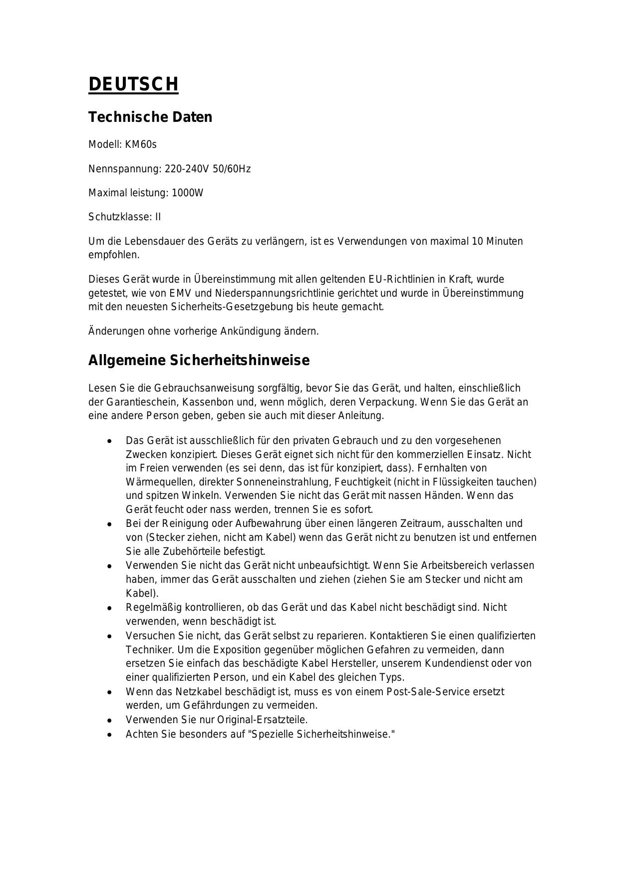 Appliquez une petite quantité d'huile végétale sur les tamis quand ils ont séché. Suggestions de recettes Biscuit (recette de base), niveau 3-4 Ingrédients : 250 g de beurre doux ou de margarine, 250 g de sucre, 1 paquet de sucre vanillé ou 1 sac de citro-back, 1 pincée de sel, 4 œufs, 500g de farine de blé, 1 paquet de levure chimique, env. 12,5 cl de lait Préparation : Versez la farine de blé et les autres ingrédients dans le bol de mélange, agitez avec le fouet pendant 30 secondes au niveau 1 puis, pendant environ 3 minutes, au niveau 3. Beurrez un moule ou couvrez-le avec du papier sulfurisé. Versez le mélange et cuisez-le. Avant d'enlever le gâteau du four, testez pour voir s'il est terminé : avec un bout de bois, percez le milieu du gâteau. Si le mélange ne colle pas, le gâteau est cuit. Placez le gâteau sur une grille à pâtisserie et laissez-le refroidir. Four traditionnel : Hauteur d'insertion : 2 Cuisson : four électrique : chauffage haut et bas 175-200°C ; four à gaz : thermostat 2-3 Durée de cuisson : 50-60 minutes Selon les goûts, vous pouvez modifier cette recette, par exemple en y ajoutant 100 g de raisins, 100 g de noix ou 100 g de chocolat en poudre. En fait, les possibilités sont infinies. Petits pains aux graines de lin, niveau 1-2 Ingrédients : 500-550 g de farine de blé, 50 g de graines de lin, 37,5 cl d'eau, 1 cube de levure (40 g), 100 g de lait écrémé caillé bien égoutté, 1 cuillérée à café de sel. Pour le glaçage : 2 cuillérées à café d'eau Préparation : Trempez les graines de lin dans 12,5 cl d'eau tiède. Transférez le reste de l'eau tiède (0,25 l) dans le bol de mélange, saupoudrez-y la levure, ajoutez le lait caillé et mélangez avec le crochet de malaxage au niveau 2. La levure doit complètement se dissoudre. Versez la farine avec les graines de lin humides et le sel dans le bol de mélange. Malaxez longuement au niveau 1, puis passez au 2 et continuez à malaxer pendant 3-5 minutes. Couvrez le mélange et laissez-le lever dans un endroit chaud pendant 45-60 minutes. Malaxez à nouveau longuement, enlevez du bol et formez seize rouleaux. Couvrez le moule avec du papier sulfurisé humide. Placez les rouleaux dessus et laissez-les lever pendant 15 minutes. Couvrez-les d'eau tiède et passez à la cuisson. Four traditionnel : Hauteur d'insertion : 2 Cuisson : four électrique : chauffage haut et bas 200-220°C (préchauffage 5 minutes), four à gaz : thermostat 2-3 Durée de cuisson : 30-40 minutes Crème au chocolat, niveau 5-6 Ingrédients : 200 ml de crème douce, 150 g de glaçage au chocolat mi-amer, 3 œufs, 50-60 g de sucre, 1 pincée de sel, 1 paquet de sucre vanillé, 1 cuillérée à café de cognac ou de rhum, chocolat en flocons Préparation : Battez la crème dans le bol de mélange avec le fouet jusqu'à obtenir une consistance dure. Enlevez-la du bol et disposez-la dans un endroit où refroidir. Faites fondre le glaçage au chocolat en suivant les instructions sur le paquet ou dans un four à micro-ondes à 600 W pendant 3 minutes. Dans le même temps, battez les œufs, le sucre, le sucre vanillé, le cognac ou le rhum, et le sel dans le bol de mélange avec le fouet au niveau 3 pour obtenir une mousse. Ajoutez le chocolat fondu et agitez de façon régulière au niveau 5-6. Gardez un peu de crème pour la décoration. Ajoutez le reste de la crème au mélange crémeux et agitez brièvement en utilisant la fonction Pulse. Décorez la crème au chocolat et servez-la fraîche. Environnement Fabriqué pour et importé par : Adeva European Import 8 rue Marc Seguin 77290 Mitry-Mory FRANCE www.adeva-import.com - contact@adeva-import.com - Tél. 01 64 67 00 01 DEUTSCH Technische Daten Modell: KM60s Nennspannung: 220-240V 50/60Hz Maximal leistung: 1000W Schutzklasse: II Um die Lebensdauer des Geräts zu verlängern, ist es Verwendungen von maximal 10 Minuten empfohlen. Dieses Gerät wurde in Übereinstimmung mit allen geltenden EU-Richtlinien in Kraft, wurde getestet, wie von EMV und Niederspannungsrichtlinie gerichtet und wurde in Übereinstimmung mit den neuesten Sicherheits-Gesetzgebung bis heute gemacht. Änderungen ohne vorherige Ankündigung ändern. Allgemeine Sicherheitshinweise Lesen Sie die Gebrauchsanweisung sorgfältig, bevor Sie das Gerät, und halten, einschließlich der Garantieschein, Kassenbon und, wenn möglich, deren Verpackung. Wenn Sie das Gerät an eine andere Person geben, geben sie auch mit dieser Anleitung. Das Gerät ist ausschließlich für den privaten Gebrauch und zu den vorgesehenen Zwecken konzipiert. Dieses Gerät eignet sich nicht für den kommerziellen Einsatz. Nicht im Freien verwenden (es sei denn, das ist für konzipiert, dass). Fernhalten von Wärmequellen, direkter Sonneneinstrahlung, Feuchtigkeit (nicht in Flüssigkeiten tauchen) und spitzen Winkeln. Verwenden Sie nicht das Gerät mit nassen Händen. Wenn das Gerät feucht oder nass werden, trennen Sie es sofort. Bei der Reinigung oder Aufbewahrung über einen längeren Zeitraum, ausschalten und von (Stecker ziehen, nicht am Kabel) wenn das Gerät nicht zu benutzen ist und entfernen Sie alle Zubehörteile befestigt. Verwenden Sie nicht das Gerät nicht unbeaufsichtigt. Wenn Sie Arbeitsbereich verlassen haben, immer das Gerät ausschalten und ziehen (ziehen Sie am Stecker und nicht am Kabel). Regelmäßig kontrollieren, ob das Gerät und das Kabel nicht beschädigt sind. Nicht verwenden, wenn beschädigt ist. Versuchen Sie nicht, das Gerät selbst zu reparieren. Kontaktieren Sie einen qualifizierten Techniker. Um die Exposition gegenüber möglichen Gefahren zu vermeiden, dann ersetzen Sie einfach das beschädigte Kabel Hersteller, unserem Kundendienst oder von einer qualifizierten Person, und ein Kabel des gleichen Typs. Wenn das Netzkabel beschädigt ist, muss es von einem Post-Sale-Service ersetzt werden, um Gefährdungen zu vermeiden. Verwenden Sie nur Original-Ersatzteile. Achten Sie besonders auf "Spezielle S