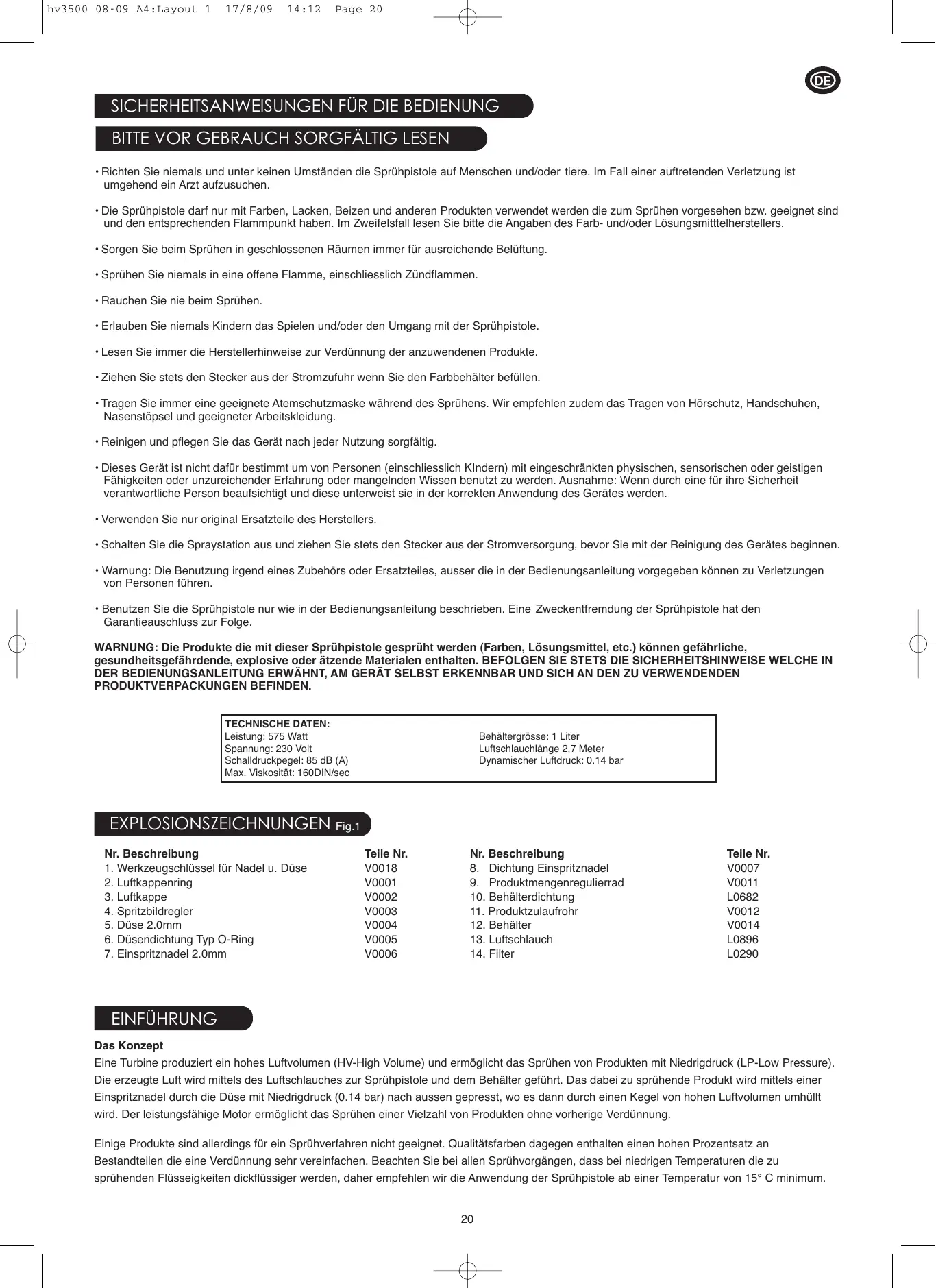 - Benutzen Sie die Sprühpistole nur wie in der Bedienungsanleitung beschrieben. Eine Zweckentfremdung der Sprühpistole hat den Garantieauschluss zur Folge. WARNUNG: Die Produkte die mit dieser Sprühpistole gesprüht werden (Farben, Lösungsmittel, etc.) können gefährliche, gesundheitsgefährdende, explosive oder ätzende Materialen enthalten. BEFOLGEN SIE STETS DIE SICHERHEITSHINWEISE WELCHE IN DER BEDIENUNGSANLEITUNG ERWÄHNT, AM GERÄT SELBST ERKENNBAR UND SICH AN DEN ZU VERWENDENDEN PRODUKTVERPACKUNGEN BEFINDEN. TECHNISCHE DATEN: Leistung: 575 Watt Spannung: 230 Volt Schalldruckpegel: 85 dB (A) Max. Viskosität: 160DIN/sec EXPLOSIONSZEICHNUNGEN Fig.1 Nr. Beschreibung