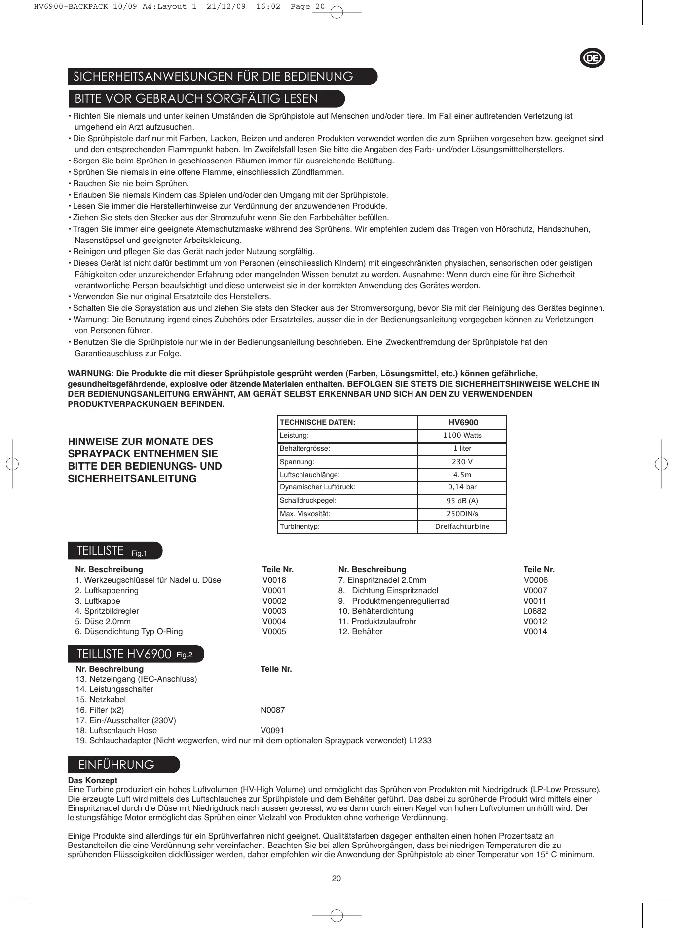 TEILLISTE HV6900 Teile Nr. V0018 V0001 V0002 V0003 V0004 V0005 4.5m 0,14 bar 95 dB (A) 250DIN/s Dreifachturbine Turbinentyp: Fig.1 1 liter 230 V Spannung: Max. Viskosität: TEILLISTE HV6900 1100 Watts Nr. Beschreibung