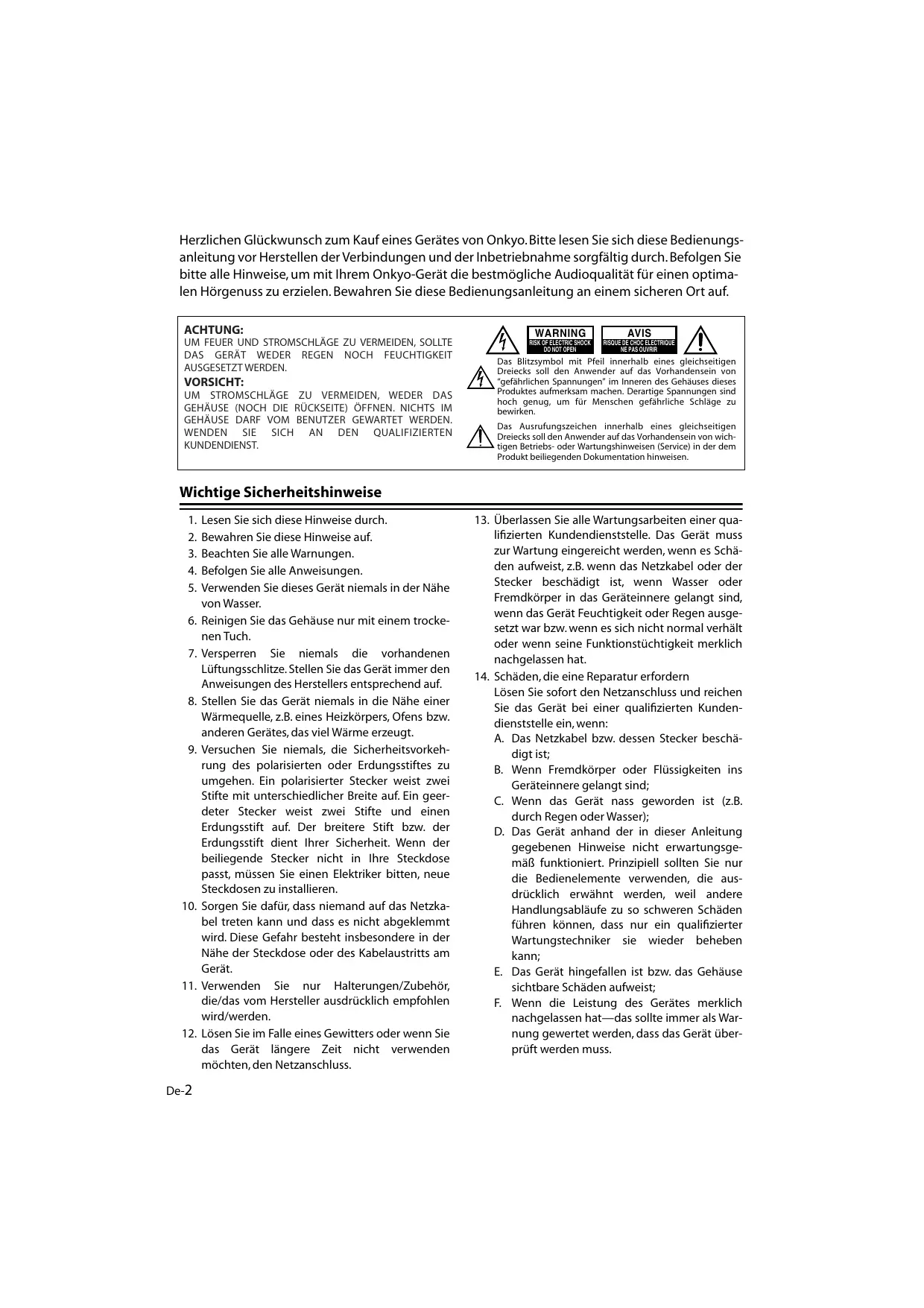 3. Berühren Sie das Gerät niemals mit nassen Händen—Fassen Sie das Netzkabel dieses Gerä- tes niemals mit nassen oder feuchten Händen an.Wenn Wasser oder andere Flüssigkeiten in das Geräteinnere gelangen, müssen Sie es sofort zur Wartung bei Ihrem Onkyo-Händler einreichen.