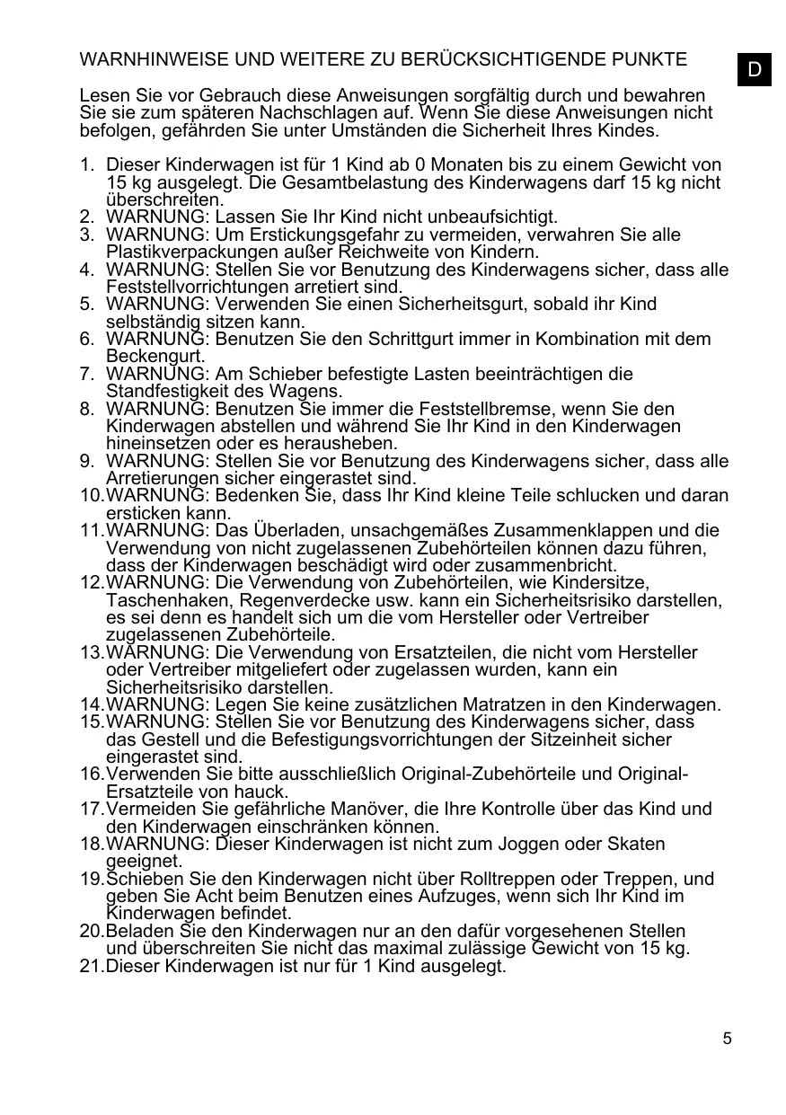 WARNHINWEISE UND WEITERE ZU BERÜCKSICHTIGENDE PUNKTE D Lesen Sie vor Gebrauch diese Anweisungen sorgfältig durch und bewahren Sie sie zum späteren Nachschlagen auf. Wenn Sie diese Anweisungen nicht befolgen, gefährden Sie unter Umständen die Sicherheit Ihres Kindes. 1. Dieser Kinderwagen ist für 1 Kind ab 0 Monaten bis zu einem Gewicht von 15 kg ausgelegt. Die Gesamtbelastung des Kinderwagens darf 15 kg nicht überschreiten. 2. WARNUNG: Lassen Sie Ihr Kind nicht unbeaufsichtigt. 3. WARNUNG: Um Erstickungsgefahr zu vermeiden, verwahren Sie alle Plastikverpackungen außer Reichweite von Kindern. 4. WARNUNG: Stellen Sie vor Benutzung des Kinderwagens sicher, dass alle Feststellvorrichtungen arretiert sind. 5. WARNUNG: Verwenden Sie einen Sicherheitsgurt, sobald ihr Kind selbständig sitzen kann. 6. WARNUNG: Benutzen Sie den Schrittgurt immer in Kombination mit dem Beckengurt. 7. WARNUNG: Am Schieber befestigte Lasten beeinträchtigen die Standfestigkeit des Wagens. 8. WARNUNG: Benutzen Sie immer die Feststellbremse, wenn Sie den Kinderwagen abstellen und während Sie Ihr Kind in den Kinderwagen hineinsetzen oder es herausheben. 9. WARNUNG: Stellen Sie vor Benutzung des Kinderwagens sicher, dass alle Arretierungen sicher eingerastet sind. 10.WARNUNG: Bedenken Sie, dass Ihr Kind kleine Teile schlucken und daran ersticken kann. 11.WARNUNG: Das Überladen, unsachgemäßes Zusammenklappen und die Verwendung von nicht zugelassenen Zubehörteilen können dazu führen, dass der Kinderwagen beschädigt wird oder zusammenbricht. 12.WARNUNG: Die Verwendung von Zubehörteilen, wie Kindersitze, Taschenhaken, Regenverdecke usw. kann ein Sicherheitsrisiko darstellen, es sei denn es handelt sich um die vom Hersteller oder Vertreiber zugelassenen Zubehörteile. 13.WARNUNG: Die Verwendung von Ersatzteilen, die nicht vom Hersteller oder Vertreiber mitgeliefert oder zugelassen wurden, kann ein Sicherheitsrisiko darstellen. 14.WARNUNG: Legen Sie keine zusätzlichen Matratzen in den Kinderwagen. 15.WARNUNG: Stellen Sie vor Benutzung des Kinderwagens sicher, dass das Gestell und die Befestigungsvorrichtungen der Sitzeinheit sicher eingerastet sind. 16.Verwenden Sie bitte ausschließlich Original-Zubehörteile und OriginalErsatzteile von hauck. 17.Vermeiden Sie gefährliche Manöver, die Ihre Kontrolle über das Kind und den Kinderwagen einschränken können. 18.WARNUNG: Dieser Kinderwagen ist nicht zum Joggen oder Skaten geeignet. 19.Schieben Sie den Kinderwagen nicht über Rolltreppen oder Treppen, und geben Sie Acht beim Benutzen eines Aufzuges, wenn sich Ihr Kind im Kinderwagen befindet. 20.Beladen Sie den Kinderwagen nur an den dafür vorgesehenen Stellen und überschreiten Sie nicht das maximal zulässige Gewicht von 15 kg. 21.Dieser Kinderwagen ist nur für 1 Kind ausgelegt.