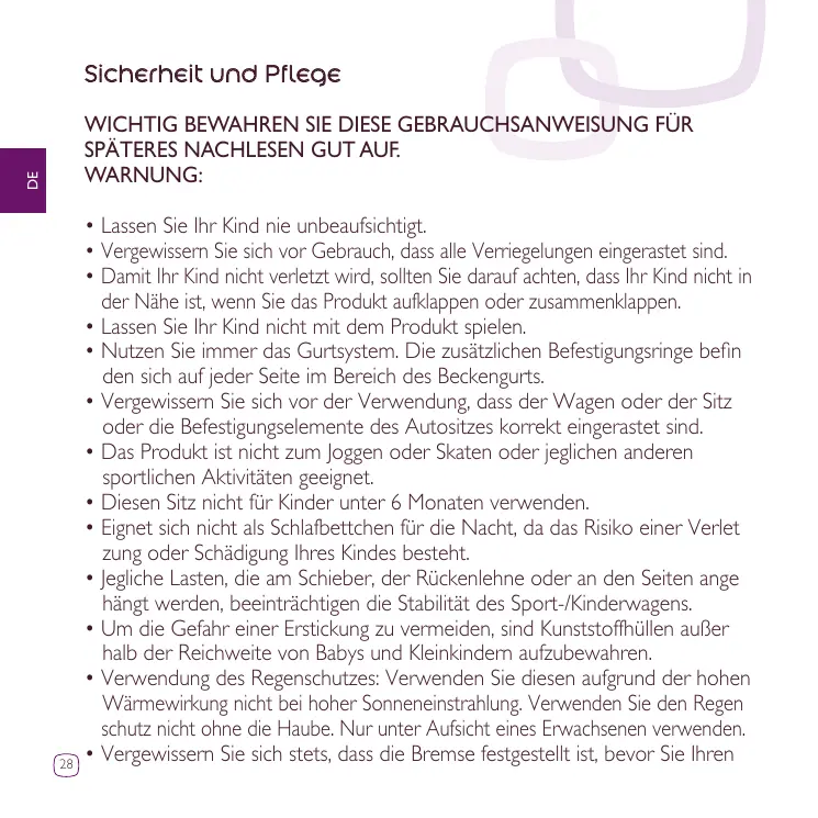 D. Bouton de verrouillage pour le pliage E. Roue arrière F. Réglage du repose-pieds G. Panier H. Roue avant I. Blocage de la roue pivotante (Buzz 3) J. Module de la roue avant (Buzz 3) K. Repose-pieds L. Harnais de sécurité M. Bouton de déver rouillage de l’arceau de maintien N. Arceau de maintien O. Protège-harnais P. Canopy Q. Adaptateurs R. Crochet de transport • Pour éviter toute blessure, maintenir votre enfant à l’écart lors du dépliage et du pliage du produit. • Ne pas laisser votre enfant jouer avec ce produit. • Toujours utiliser le système de retenue. Des anneaux pour la fixation d’un harnais supplémentaire sont situés au niveau de la ceinture de maintien, de chaque côté. • Vérifier que les dispositifs de fixation de la nacelle, du siège ou du siège-auto sont correctement enclenchés avant utilisation. • Ce produit ne convient pas pour faire du jogging ou des promenades en rollers et toutes autres activités sportives. • Ce siège ne convient pas à des enfants de moins de 6 mois • Ne convient pas pour de longue période de sommeil, votre enfant risquer ait d’être en danger. • Le fait d’accrocher une charge au poussoir, dossier ou côtés influe sur la stabilité du landau/de la poussette. • Pour éviter les risques d’étouffement, conservez les sacs plastique de l’emballage hors de portée des bébés et des jeunes enfants. • Utilisation de l’habillage-pluie: Ne pas utiliser en cas de temps ensoleillé, pour cause de chaleur excessive. Ne pas utiliser l’habillage pluie sans la capote. 25