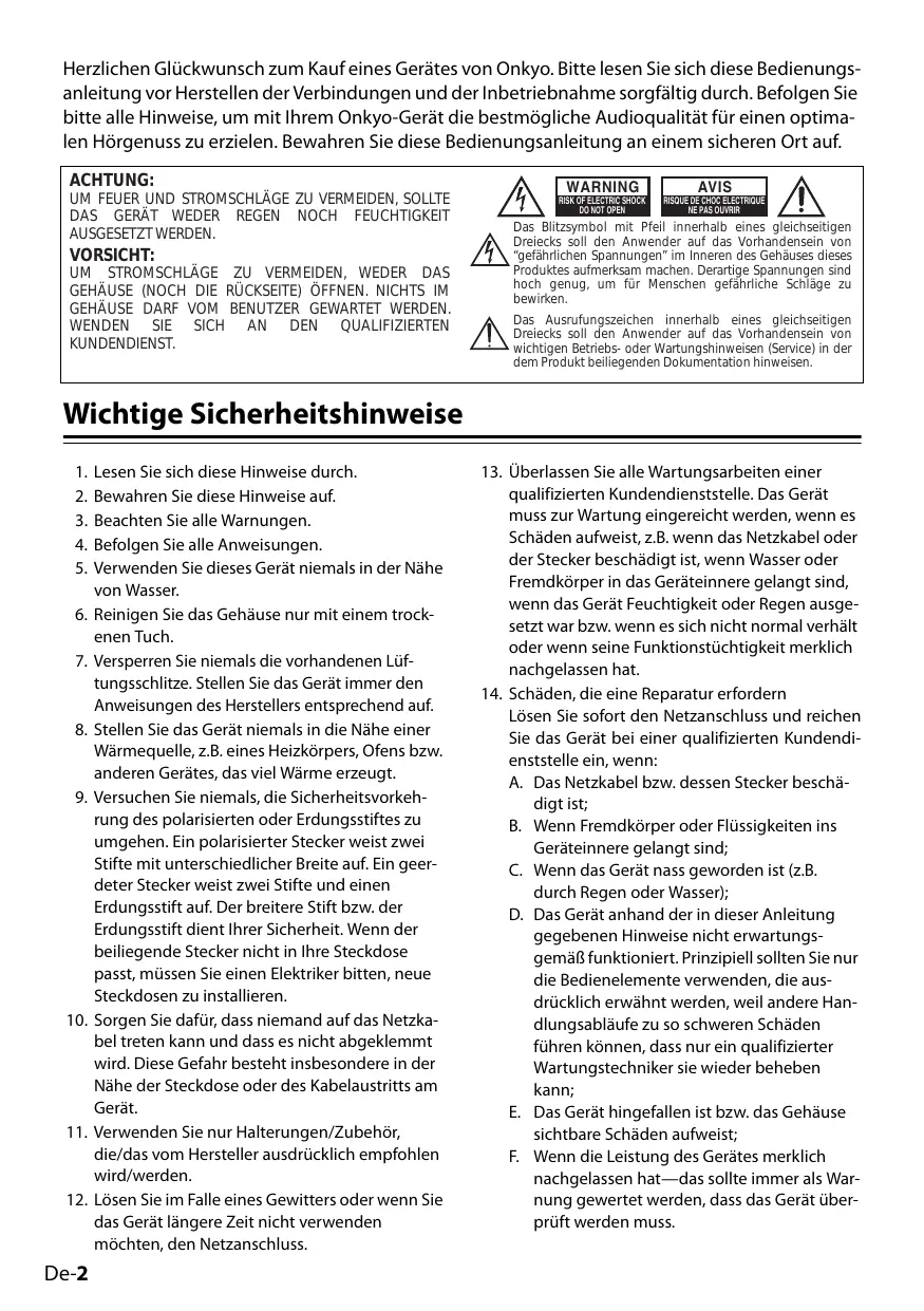 Herzlichen Glückwunsch zum Kauf eines Gerätes von Onkyo. Bitte lesen Sie sich diese Bedienungsanleitung vor Herstellen der Verbindungen und der Inbetriebnahme sorgfältig durch. Befolgen Sie bitte alle Hinweise, um mit Ihrem Onkyo-Gerät die bestmögliche Audioqualität für einen optimalen Hörgenuss zu erzielen. Bewahren Sie diese Bedienungsanleitung an einem sicheren Ort auf. ACHTUNG: UM FEUER UND STROMSCHLÄGE ZU VERMEIDEN, SOLLTE DAS GERÄT WEDER REGEN NOCH FEUCHTIGKEIT AUSGESETZT WERDEN.