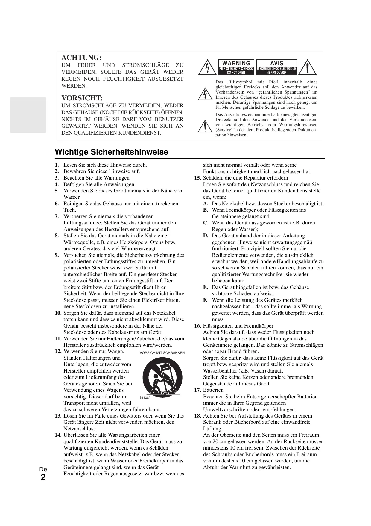 Ne vous servez pas de cet appareil à proximité d’eau. Essuyez le boîtier avec un chiffon sec uniquement. Ne bloquez pas les orifices d’aération. Installez cet appareil en suivant les instructions du fabricant. Ne le placez pas à proximité de sources de chaleur telles que radiateurs, chauffage, poêles ou autre dispositif (y compris les amplificateurs) générateur de chaleur. N’essayez pas de circonvenir le dispositif de sécurité que représente une fiche polarisée ou une fiche avec mise à la terre. Une fiche polarisée dispose de deux lames dont l’une est plus large que l’autre. Une fiche avec terre est munie de deux lames ainsi que d’une broche de mise à la terre. La lame la plus large ou la broche assurent votre sécurité. Si la fiche fournie ne peut être insérée dans la prise murale, demandez à un électricien de remplacer la prise. Protégez le cordon d’alimentation en évitant qu’on ne marche pas dessus et qu’il ne soit plié (notamment au niveau des fiches, des cache-câbles et de la sortie de l’appareil). Servez-vous exclusivement des fixations/accessoires préconisés par le fabricant. Utilisez exclusivement le AVERTISSEMENT POUR chariot, le support, le trépied, la SUPPORTS À ROULETTES fixation ou la table spécifié(e) par le fabricant ou vendu(e) avec l’appareil. Un chariot contenant l’appareil doit toujours être déplacé avec précaution pour éviter qu’il ne S3125A se renverse et blesse quelqu’un. Débranchez l’appareil durant un orage ou lorsqu’il reste inutilisé longtemps. Veuillez faire appel à un technicien qualifié pour l’entretien. Un entretien est indispensable si l’appareil a été endommagé d’une façon ou d’une autre : cordon d’alimentation ou fiche endommagée, liquide renversé ou chute de petits objets dans l’appareil, exposition à la pluie ou à une humidité excessive, fonctionnement anormal ou chute de l’appareil.
