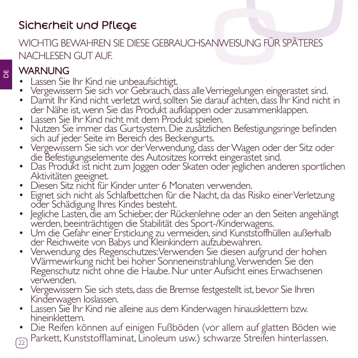 • Pour éviter toute blessure, maintenir votre enfant à l’écart lors du dépliage et du pliage du produit. • Ne pas laisser votre enfant jouer avec ce produit. • Toujours utiliser le système de retenue. Des anneaux pour la fixation d’un harnais supplémentaire sont situés au niveau de la ceinture de maintien, de chaque côté. • Vérifier que les dispositifs de fixation de la nacelle, du siège ou du siège-auto sont correctement enclenchés avant utilisation. • Ne pas utiliser ce produit en faisant du jogging ou des promenades en rollers et toutes autres activités sportives. • Ne pas utiliser ce siège pour des enfants de moins de 6 mois. • Ne convient pas pour de longue période de sommeil, votre enfant risquerait d’être en danger. • Le fait d’accrocher une charge au poussoir, dossier ou côtés influe sur la stabilité du landau/de la poussette. • Pour éviter les risques d’étouffement, conservez les sacs plastique de l’emballage hors de portée des bébés et des jeunes enfants. • Utilisation de l’habillage-pluie: Ne pas utiliser en cas de temps ensoleillé, pour cause de chaleur excessive. Ne pas utiliser l’habillage pluie sans la capote. A utiliser sous la surveillance d’un adulte. • Toujours vérifier que le frein est bien engagé avant de lâcher votre poussette. • Ne jamais laisser votre enfant monter et descendre seul de la poussette. • Les pneus peuvent laisser des traces noires sur certains sols (surtout les sols lisses comme les parquets, les laminés synthétiques, le linoléum, etc.). 19