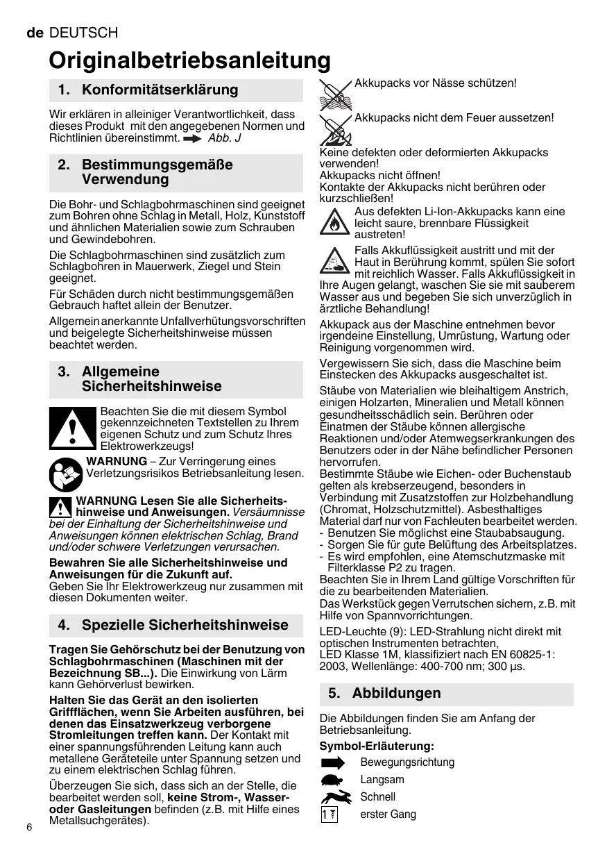 2. Bestimmungsgemäße Verwendung Die Bohr- und Schlagbohrmaschinen sind geeignet zum Bohren ohne Schlag in Metall, Holz, Kunststoff und ähnlichen Materialien sowie zum Schrauben und Gewindebohren. Die Schlagbohrmaschinen sind zusätzlich zum Schlagbohren in Mauerwerk, Ziegel und Stein geeignet. Für Schäden durch nicht bestimmungsgemäßen Gebrauch haftet allein der Benutzer. Allgemein anerkannte Unfallverhütungsvorschriften und beigelegte Sicherheitshinweise müssen beachtet werden.