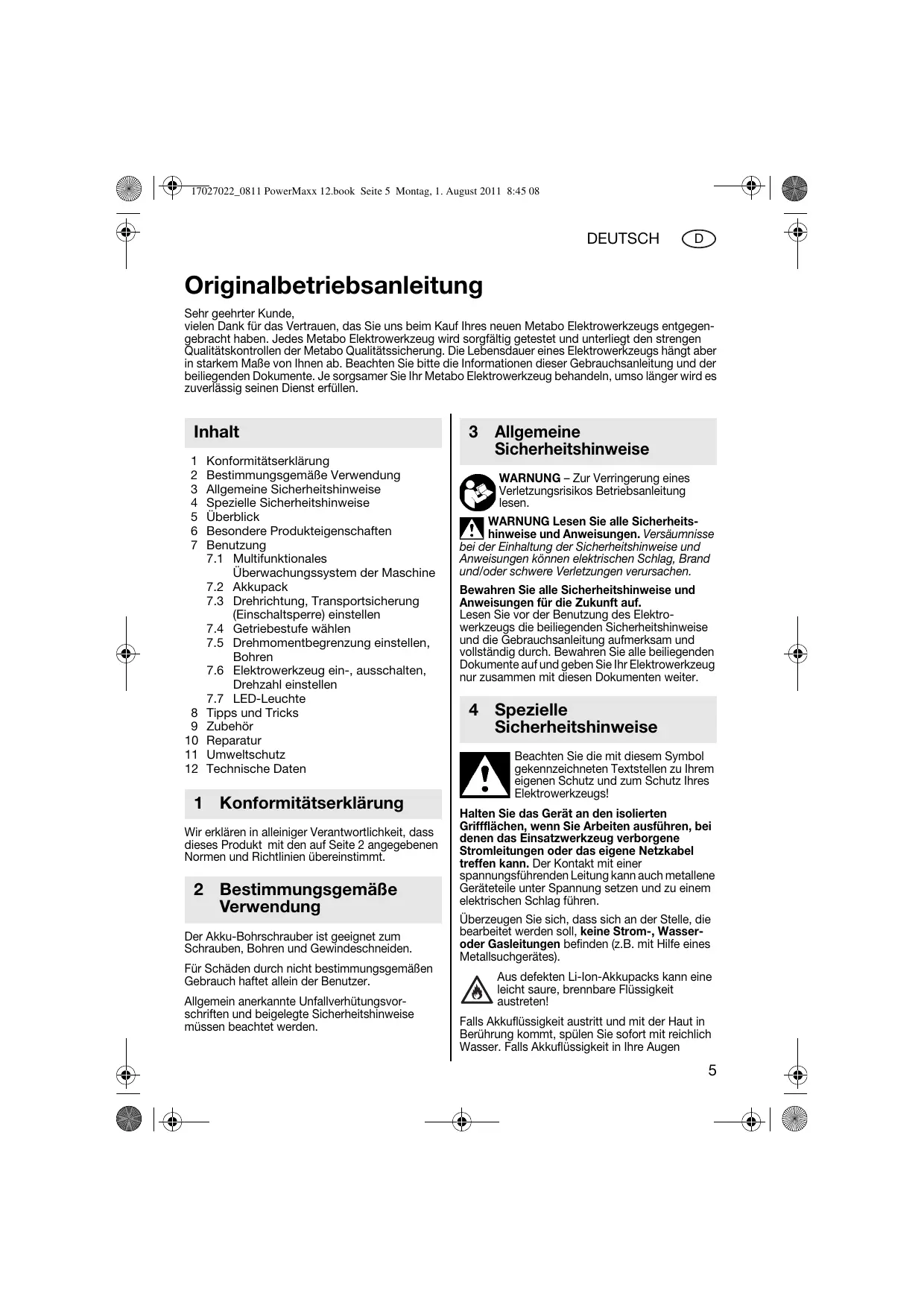 DEUTSCH D Originalbetriebsanleitung Sehr geehrter Kunde, vielen Dank für das Vertrauen, das Sie uns beim Kauf Ihres neuen Metabo Elektrowerkzeugs entgegengebracht haben. Jedes Metabo Elektrowerkzeug wird sorgfältig getestet und unterliegt den strengen Qualitätskontrollen der Metabo Qualitätssicherung. Die Lebensdauer eines Elektrowerkzeugs hängt aber in starkem Maße von Ihnen ab. Beachten Sie bitte die Informationen dieser Gebrauchsanleitung und der beiliegenden Dokumente. Je sorgsamer Sie Ihr Metabo Elektrowerkzeug behandeln, umso länger wird es zuverlässig seinen Dienst erfüllen.