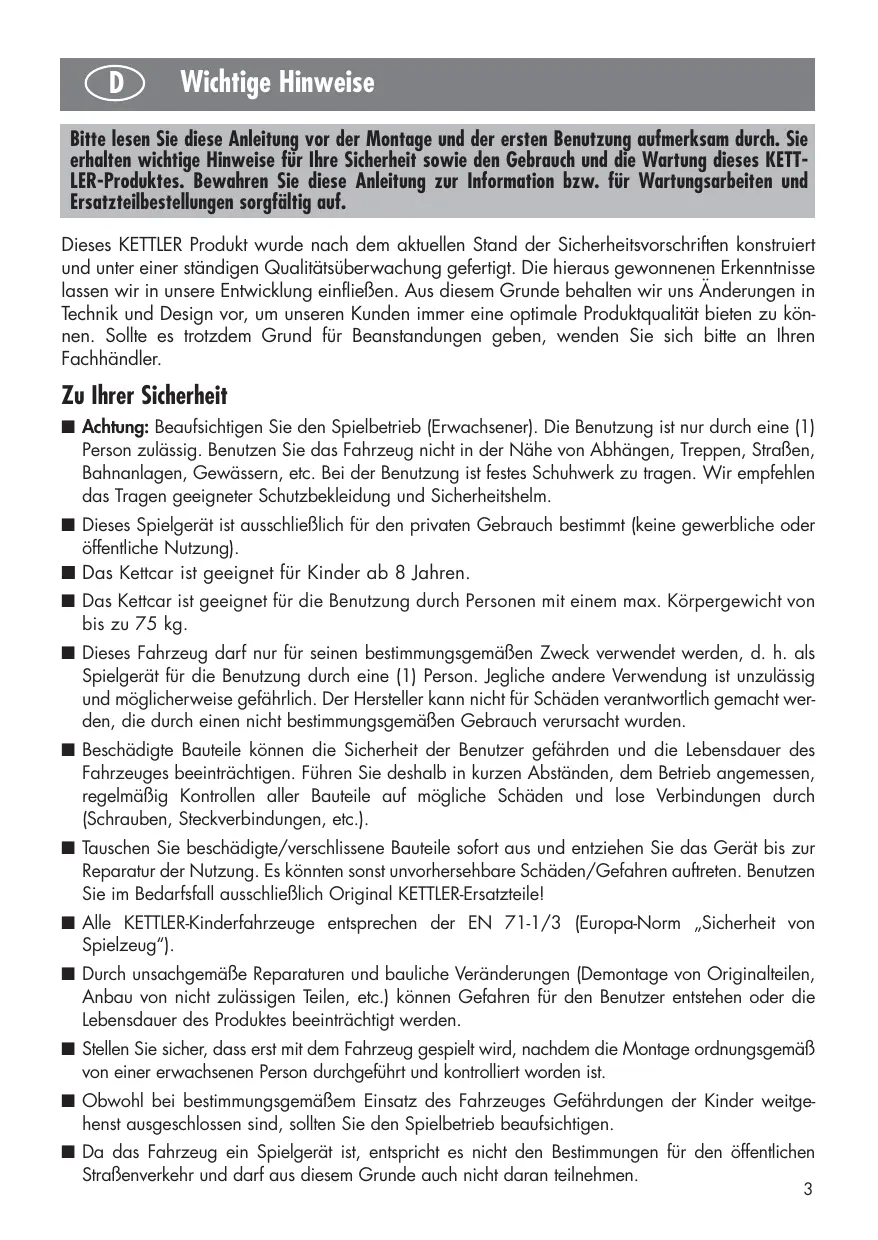 Attention: Ne laissez l’enfant jouer que sous la surveillance d’adultes. L’utilisation du véhicule est autorisée seulement pour une personne. N’utilisez pas le véhicule aux abords de pentes, d’escaliers, de routes, d’installations ferroviaires, de cours d’eau, etc. Pour utiliser le véhicule, il faut porter des chaussures solides et fermées. Nous conseillons également le port de vêtements de protection appropriés et d’un casque de sécurité. L’utilisation n'est autorisée que dans le domaine privé (ne pas d’utilisation commercielle ou public). Le produit est fait pour les enfants plus de 8 ans. Le kart peut être utilisé par les personnes dont le poids maximum ne dépasse pas 75 kg. Ce véhicule ne peut être utilisé que dans le but pour lequel il a été construit, c’est-à-dire en tant que véhicule de jeu dont l’utilisation est prévue pour une seule personne. Toute autre utilisation n’est pas permise et pourrait être dangereuse. Le fabricant ne peut pas être rendu responsable des dommages causés à la suite d’une utilisation dans un but autre que celui prévu. Des éléments de construction endommagés peuvent mettre en danger la sécurité des utilisateurs et nuire à la durabilité du véhicule. Vérifiez régulièrement et à de courts intervalles, en fonction de l’utilisation, si tous les éléments de construction sont en bon état et si certains assemblages ne sont pas desserrés (vis, cavaliers, etc.) Tout élément de construction endommagé ou usé doit être immédiatement remplacé. Le véhicule doit alors être retiré de la circulation jusqu’à sa remise en état. En cas de besoin, veillez à n’utiliser que des pièces de rechange d’origine de la société KETTLER. Tous les véhicules de KETTLER conforment à la norme EN 71-1/3 (Norme européenne de la sècuritée des jouets). Toute réparation incorrecte ou modification de construction (démontage de pièces d’origine, construction de pièces non autorisées, etc.) peut mettre en danger la sécurité de l’utilisateur et nuire à la durabilité du véhicule. Avant la mise en circulation du véhicule, assurez-vous si l’assemblage a été exécuté correctement et contrôlé par un adulte. Bien qu’une utilisation correcte et appropriée exclue pratiquement tout risque pour les enfants, ne laissez pas les enfants jouer sans surveillance. S’agissant d’un véhicule de jeu, ce véhicule ne répond pas aux normes d’agrément pour la circulation sur la voie publique. Il ne peut donc pas circuler sur la voie publique. 13