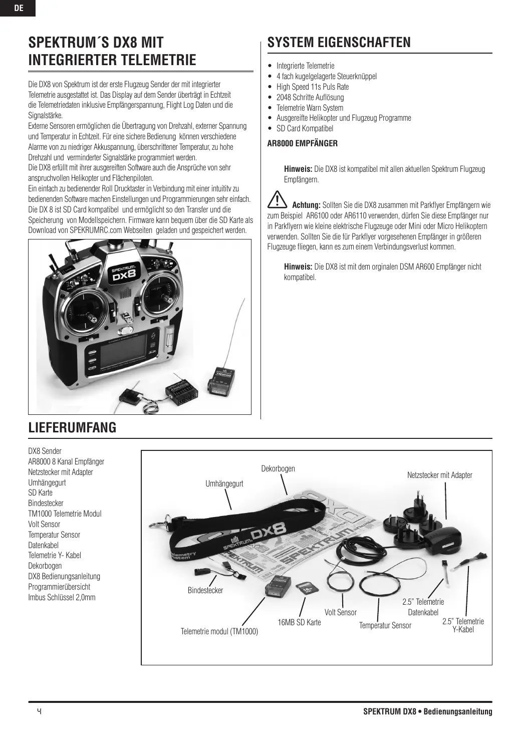 Lieferumfang DX8 Sender AR8000 8 Kanal Empfänger Netzstecker mit Adapter Umhängegurt SD Karte Bindestecker TM1000 Telemetrie Modul Volt Sensor Temperatur Sensor Datenkabel Telemetrie Y- Kabel Dekorbogen DX8 Bedienungsanleitung Programmierübersicht Imbus Schlüssel 2,0mm