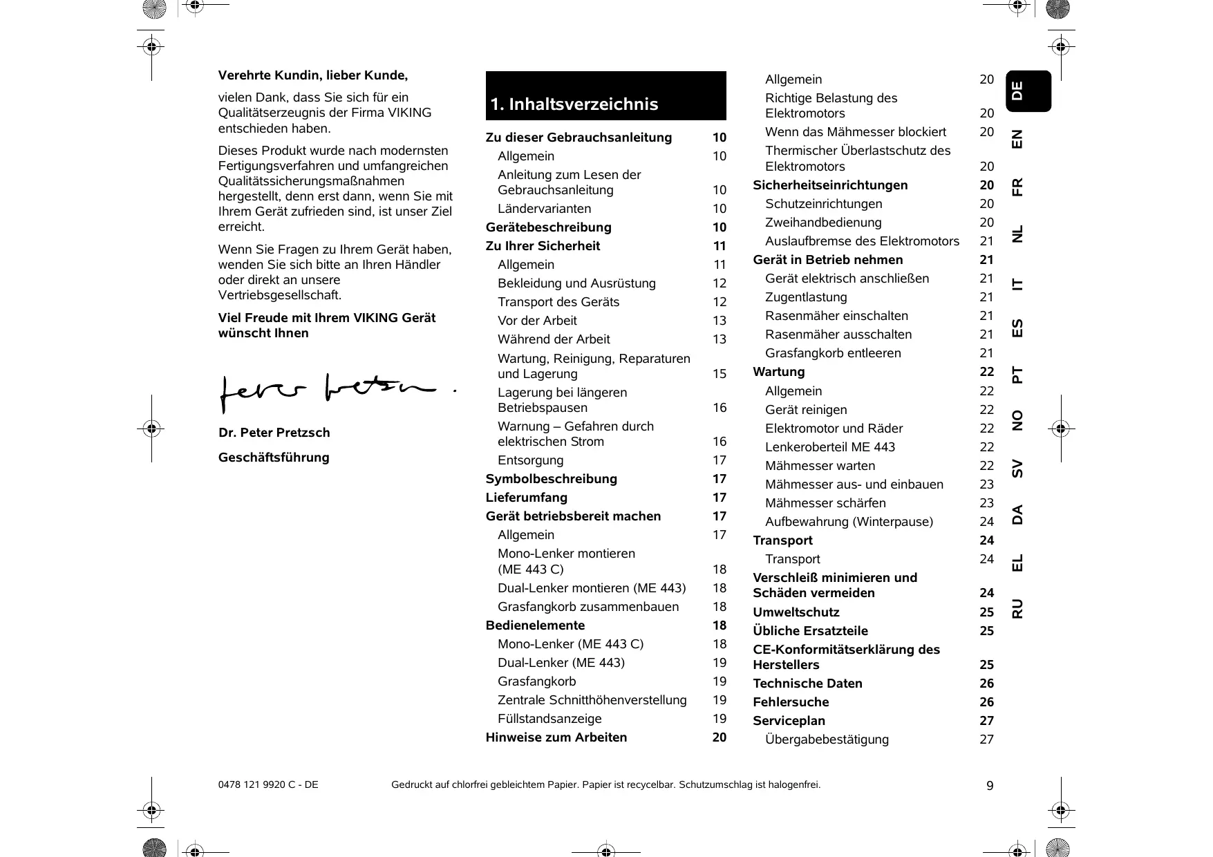 Zu dieser Gebrauchsanleitung Allgemein Anleitung zum Lesen der Gebrauchsanleitung Ländervarianten Gerätebeschreibung Zu Ihrer Sicherheit Allgemein Bekleidung und Ausrüstung Transport des Geräts Vor der Arbeit Während der Arbeit Wartung, Reinigung, Reparaturen und Lagerung Lagerung bei längeren Betriebspausen Warnung – Gefahren durch elektrischen Strom Entsorgung Symbolbeschreibung Lieferumfang Gerät betriebsbereit machen Allgemein Mono-Lenker montieren (ME 443 C) Dual-Lenker montieren (ME 443) Grasfangkorb zusammenbauen Bedienelemente Mono-Lenker (ME 443 C) Dual-Lenker (ME 443) Grasfangkorb Zentrale Schnitthöhenverstellung Füllstandsanzeige Hinweise zum Arbeiten