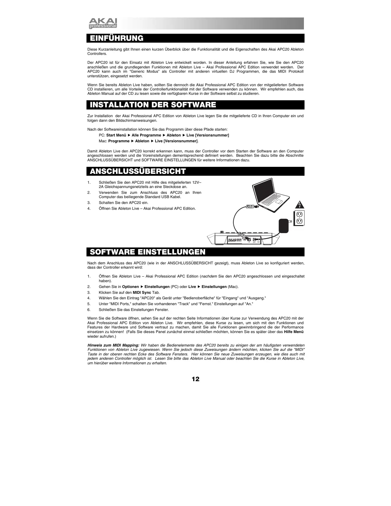 Der APC20 ist für den Einsatz mit Ableton Live entwickelt worden. In dieser Anleïlung erfahren Sie, wie Sie den APC20 anschlieBen und die grundlegenden Funktionen mit Ableton Live — Akai Professional APC Edition verwendet werden. Der APC20 kann auch im “Generic Modus” als Controller mit anderen virtuellen DJ Programmen, die das MIDI Protokoll unterstützen, eingesetzt werden.