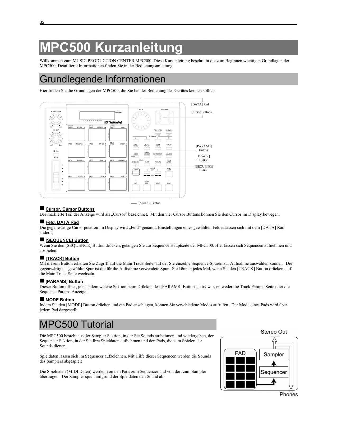 MPC500 Kurzanleitung Willkommen zum MUSIC PRODUCTION CENTER MPC500. Diese Kurzanleitung beschreibt die zum Beginnen wichtigen Grundlagen der MPC500. Detaillierte Informationen finden Sie in der Bedienungsanleitung.