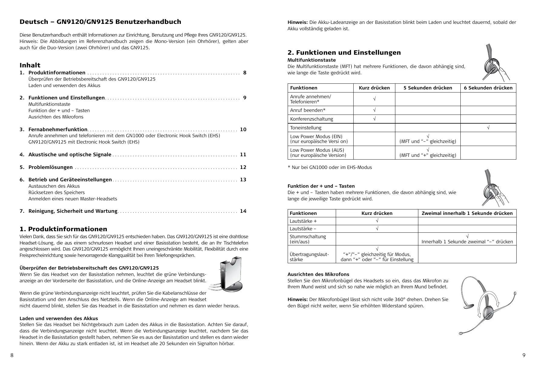 Deutsch – GN9120/GN9125 Benutzerhandbuch Diese Benutzerhandbuch enthält Informationen zur Einrichtung, Benutzung und Pflege Ihres GN9120/GN9125. Hinweis: Die Abbildungen im Referenzhandbuch zeigen die Mono-Version (ein Ohrhörer), gelten aber auch für die Duo-Version (zwei Ohrhörer) und das GN9125.