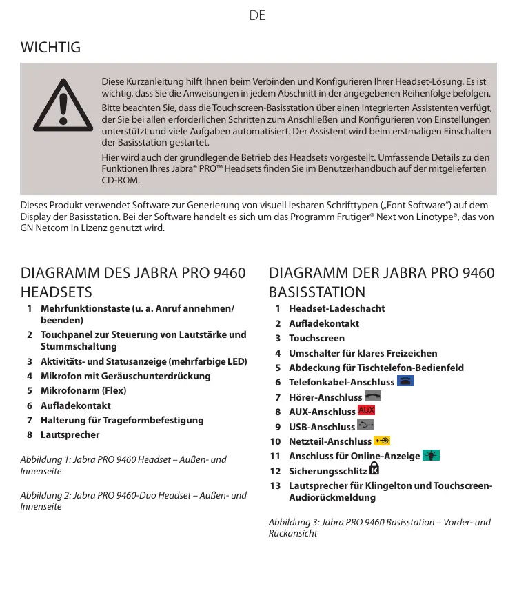 DE WICHTIG Diese Kurzanleitung hilft Ihnen beim Verbinden und Konfigurieren Ihrer Headset-Lösung. Es ist wichtig, dass Sie die Anweisungen in jedem Abschnitt in der angegebenen Reihenfolge befolgen. Bitte beachten Sie, dass die Touchscreen-Basisstation über einen integrierten Assistenten verfügt, der Sie bei allen erforderlichen Schritten zum Anschließen und Konfigurieren von Einstellungen unterstützt und viele Aufgaben automatisiert. Der Assistent wird beim erstmaligen Einschalten der Basisstation gestartet. Hier wird auch der grundlegende Betrieb des Headsets vorgestellt. Umfassende Details zu den Funktionen Ihres Jabra® PRO™ Headsets finden Sie im Benutzerhandbuch auf der mitgelieferten CD-ROM. Dieses Produkt verwendet Software zur Generierung von visuell lesbaren Schrifttypen („Font Software“) auf dem Display der Basisstation. Bei der Software handelt es sich um das Programm Frutiger® Next von Linotype®, das von GN Netcom in Lizenz genutzt wird.