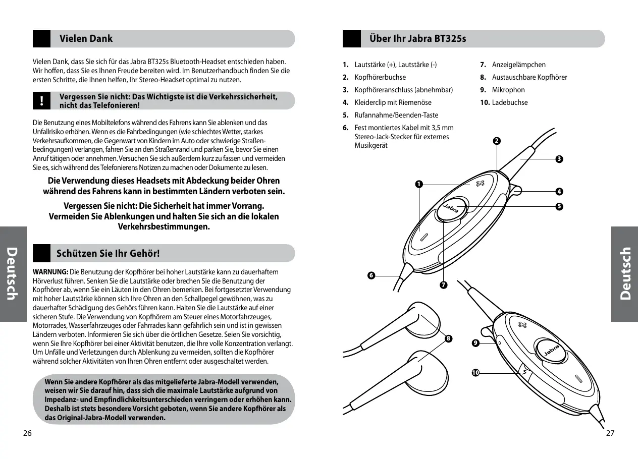 Vielen Dank, dass Sie sich für das Jabra BT325s Bluetooth-Headset entschieden haben. Wir hoffen, dass Sie es Ihnen Freude bereiten wird. Im Benutzerhandbuch finden Sie die ersten Schritte, die Ihnen helfen, Ihr Stereo-Headset optimal zu nutzen.