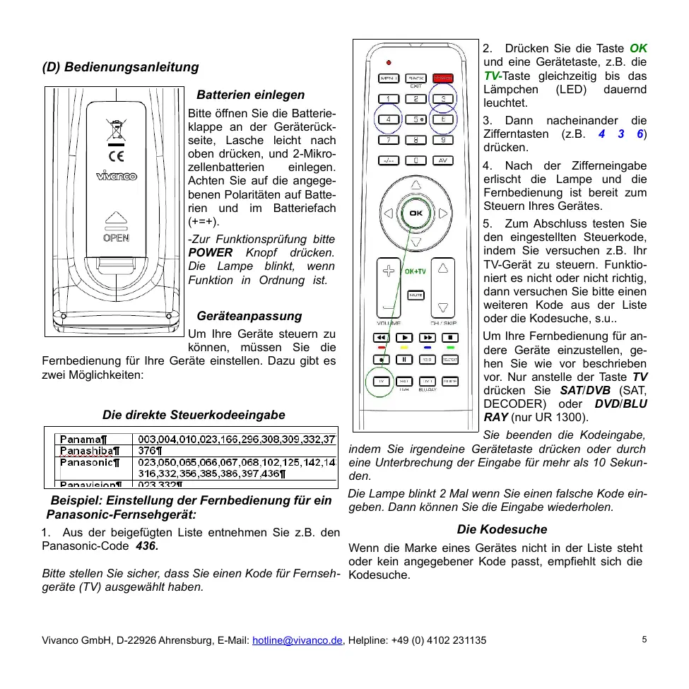 Die Kodesuche 1. Aus der beigefügten Liste entnehmen Sie z.B. den Panasonic-Code 436. Wenn die Marke eines Gerätes nicht in der Liste steht oder kein angegebener Kode passt, empfiehlt sich die Bitte stellen Sie sicher, dass Sie einen Kode für Fernseh- Kodesuche. geräte (TV) ausgewählt haben.