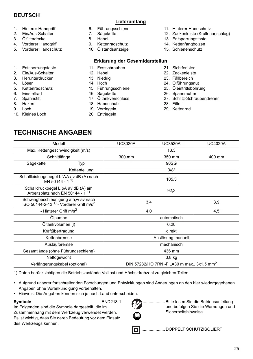 Festschrauben Hebel Niedrig Hoch Führungsschiene Sägekette Öltankverschluss Handschutz Verriegeln Entriegeln Sichtfenster Zackenleiste Fällbereich Ölführungsnut Öleintrittsbohrung Spannmutter Schlitz-Schraubendreher Filter Kettenrad TECHNISCHE ANGABEN Modell UC3020A UC3520A Max. Kettengeschwindigkeit (m/s) Schnittlänge 300 mm Sägekette 350 mm Typ Kettenteilung 3/8" 105,3 Schalldruckpegel L pA av dB (A) am Arbeitsplatz nach EN 50144 - 1 1) 92,3 Schwingbeschleunigung a h,w av nach ISO 50144-2-13 1) - Vorderer Griff m/s2