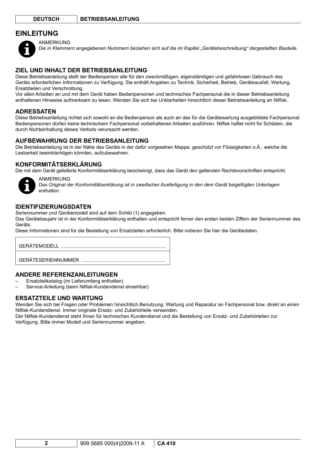 Die Betriebsanleitung ist in der Nähe des Geräts in der dafür vorgesehen Mappe, geschützt vor Flüssigkeiten o.À., welche die Lesbarkeit beeinträchtigen kônnten, aufzubewahren. KONFORMITÂTSERKLARUNG Die mit dem Gerät gelieferte Konformitätserklärung bescheinigt, dass das Gerät den geltenden Rechtsvorschriften entspricht. ANMERKUNG Das Original der Konformitätserklärung ist in zweifacher Ausfertigung in den dem Gerät beigefügten Unterlagen enthalten. IDENTIFIZIERUNGSDATEN Seriennummer und Gerätemodell sind auf dem Schild (1) angegeben. Das Gerätebaujahr ist in der Konformitätserklärung enthalten und entspricht ferner den ersten beiden Ziffern der Seriennummer des Geräts. Diese Informationen sind für die Bestellung von Ersatzteilen erforderlich. Bitte notieren Sie hier die Gerätedaten. GERÂTEMODELL … GERÂTESERIENNUMMER ANDERE REFERENZANLEITUNGEN — Ersatzteilkatalog (im Lieferumfang enthalten) — Service-Anleitung (beim Nilfisk-Kundendienst einsehbar)