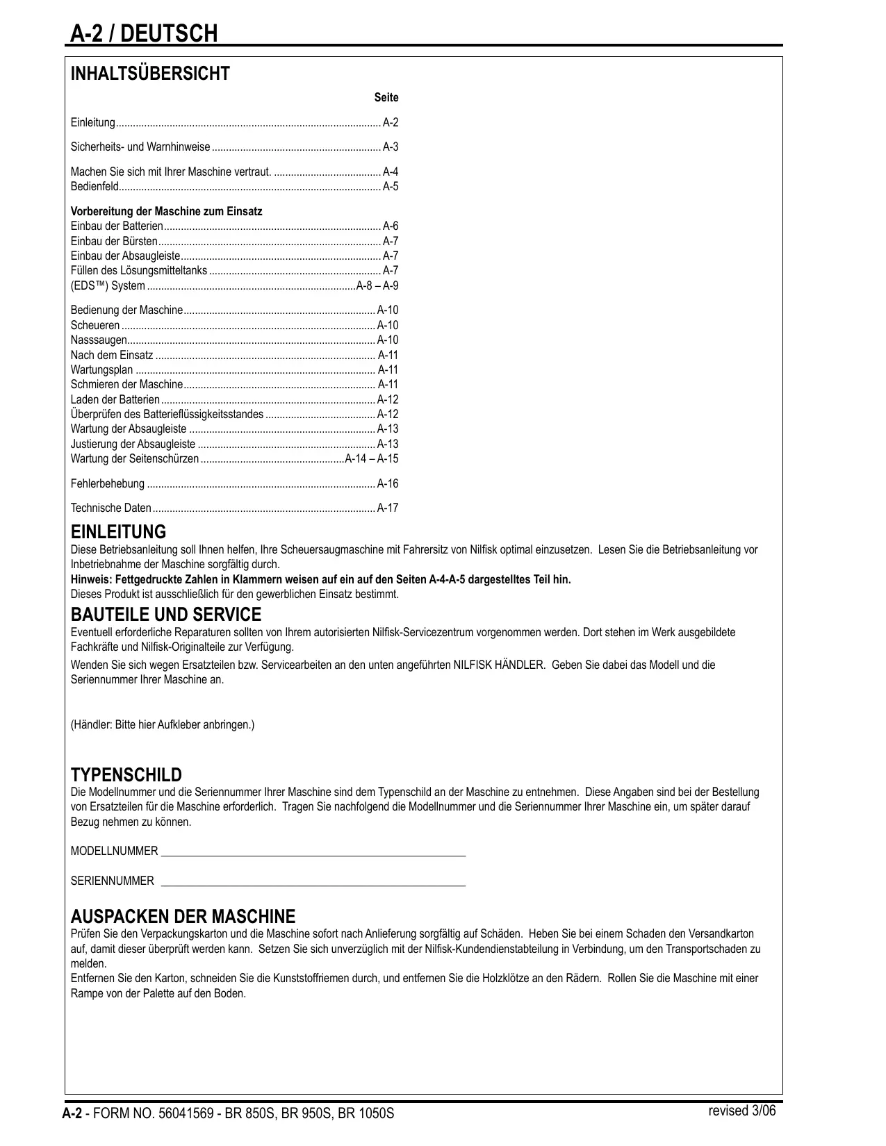 Printed in USA A-2 / DEUTSCH INHALTSÜBERSICHT Seite Einleitung A-2 Sicherheits- und Warnhinweise A-3 Machen Sie sich mit Ihrer Maschine vertraut. A-4 Bedienfeld A-5 Vorbereitung der Maschine zum Einsatz Einbau der Batterien A-6 Einbau der Bürsten A-7 Einbau der Absaugleiste A-7 Füllen des Lösungsmitteltanks A-7 (EDS™) System A-8 – A-9 Bedienung der Maschine A-10 Scheueren A-10 Nasssaugen A-10 Nach dem Einsatz A-11 Wartungsplan A-11 Schmieren der Maschine A-11 Laden der Batterien A-12 Überprüfen des Batterieflüssigkeitsstandes A-12 Wartung der Absaugleiste A-13 Justierung der Absaugleiste A-13 Wartung der Seitenschürzen A-14 – A-15 Fehlerbehebung A-16 Technische Daten A-17