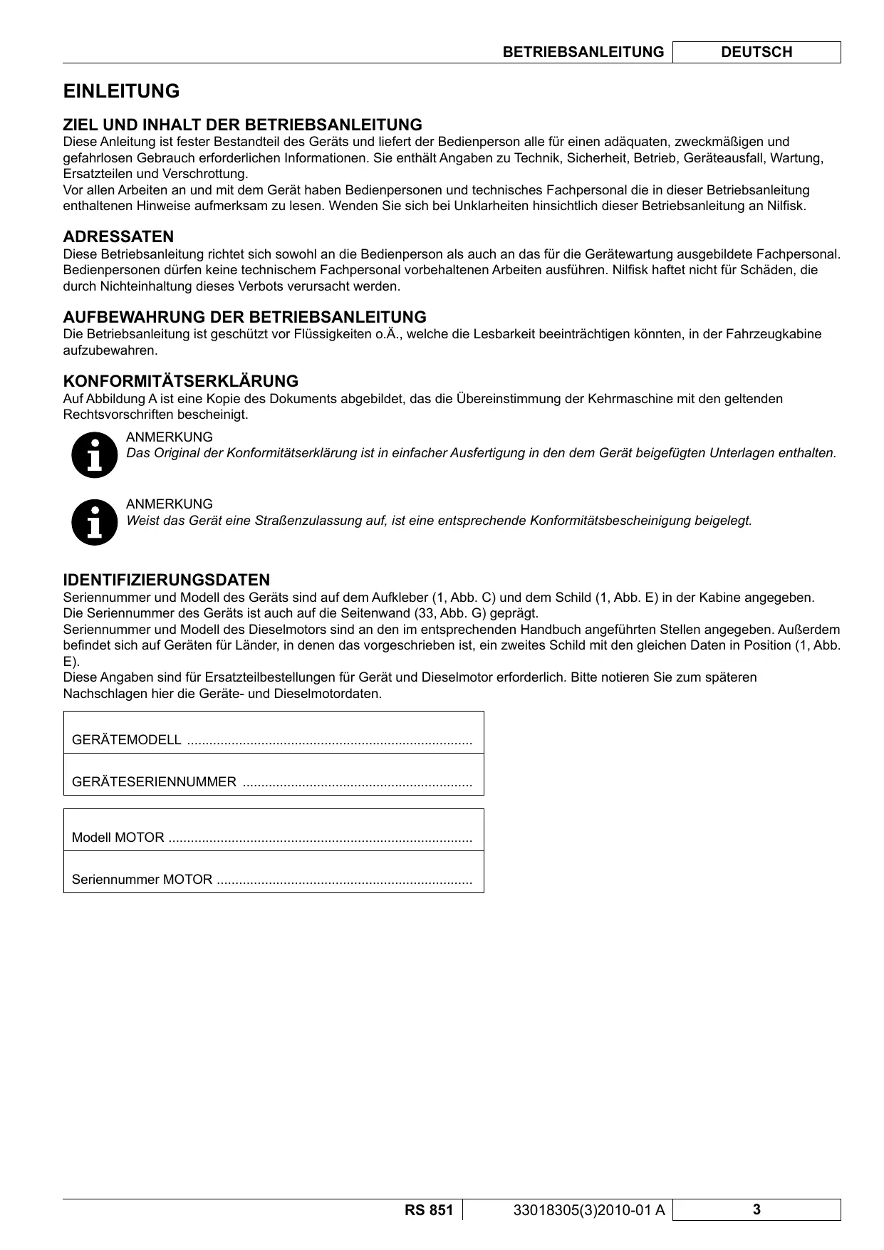 Modèle MACHINE Numéro de série MACHINE Modèle MOTEUR Numéro de série MOTEUR RS 851