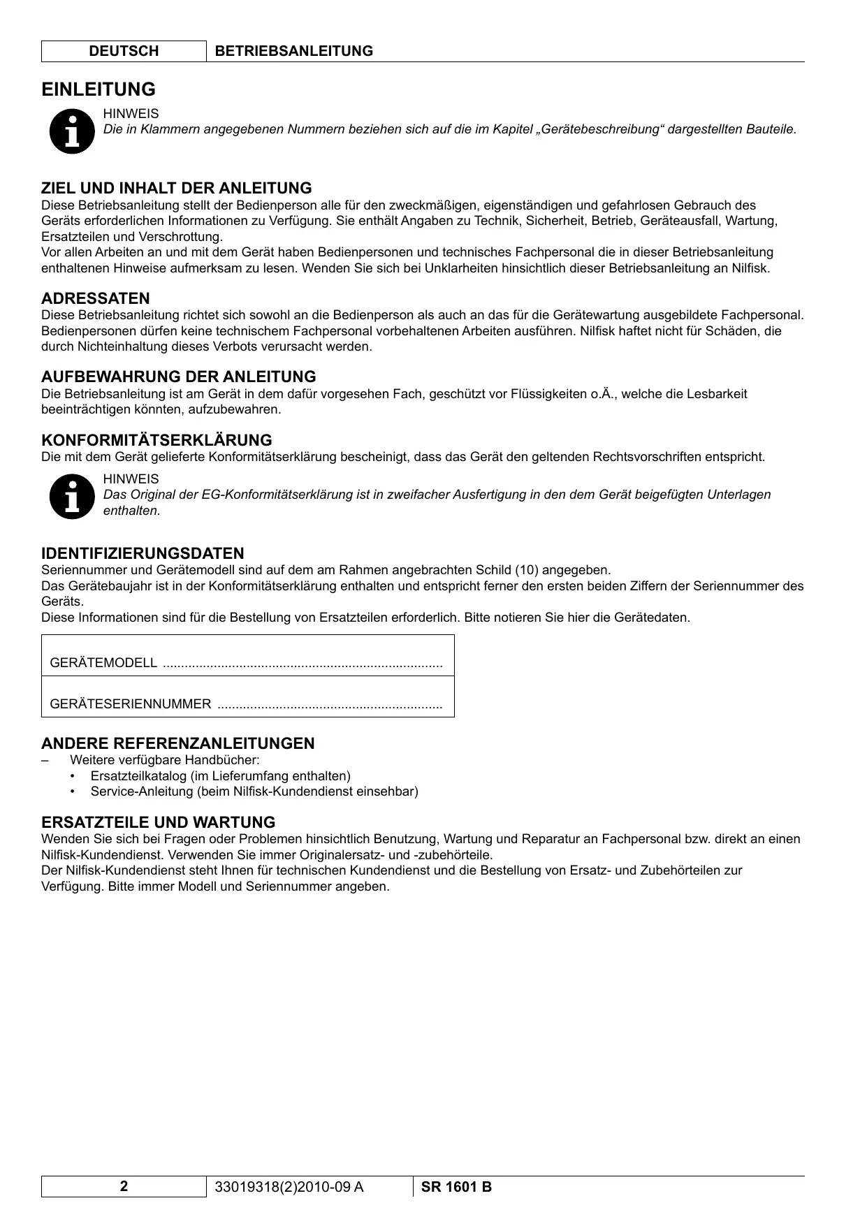 Vor allen Arbeiten an und mit dem Gerät haben Bedienpersonen und technisches Fachpersonal die in dieser Betriebsanleitung enthaltenen Hinweise aufmerksam zu lesen. Wenden Sie sich bei Unklarheiten hinsichtlich dieser Betriebsanleitung an Nilfisk.