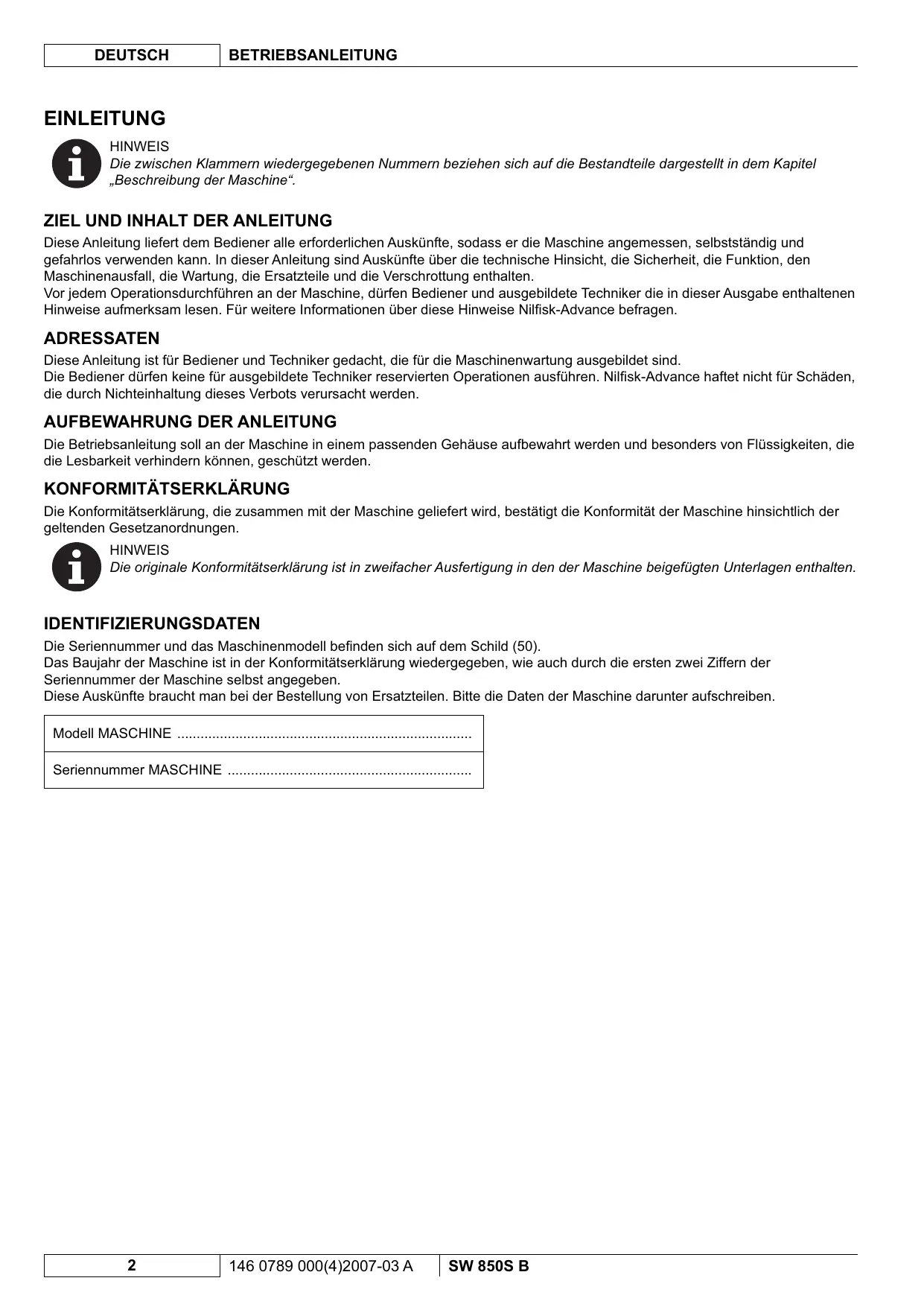 SW 850S - Industrielle Kehrmaschine NILFISK - Kostenlose Bedienungsanleitung