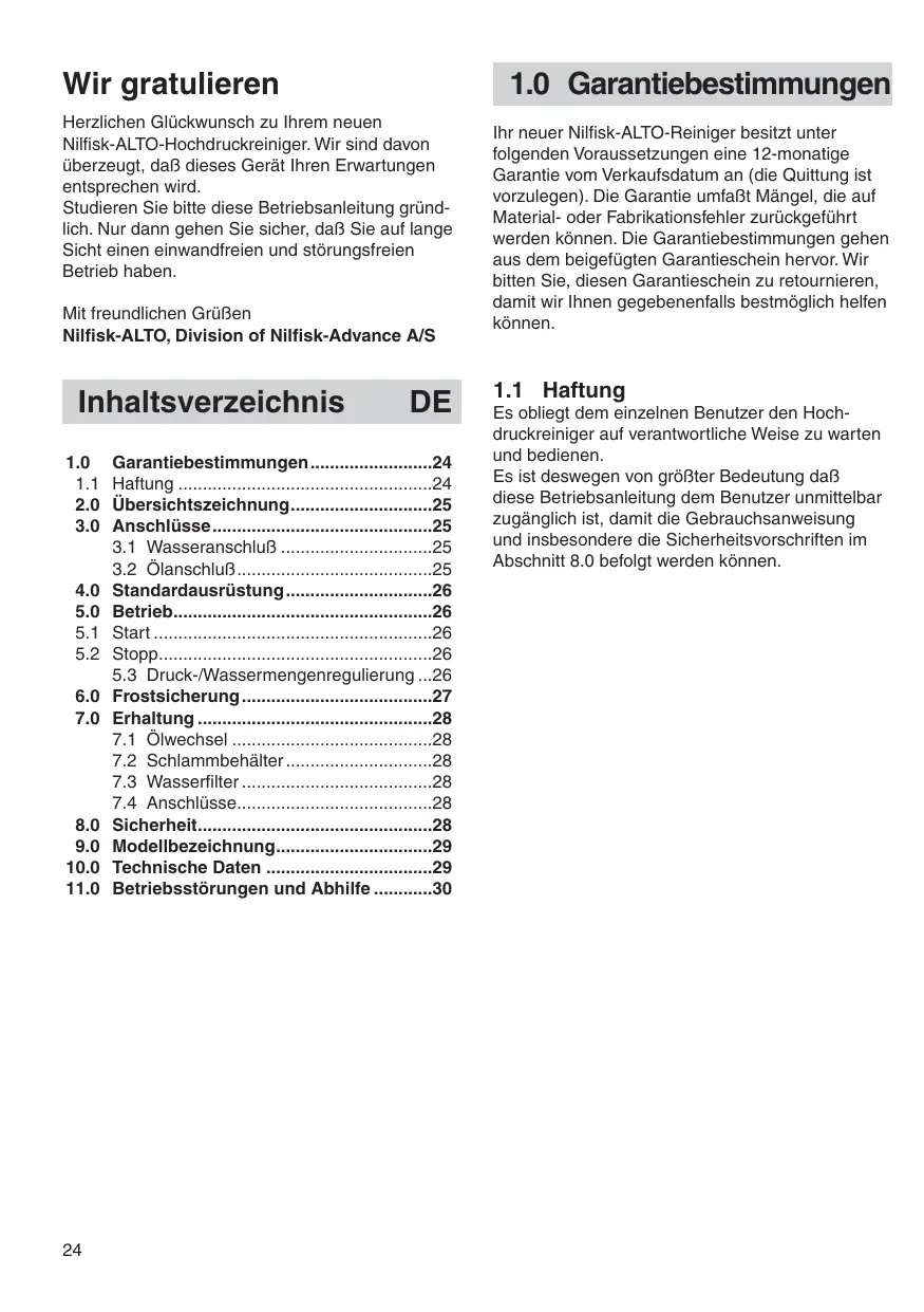 DE *) Mit kaltem Wasser (bis zu 8°C) kann das Gerät mit einem Höhenunterschied von 5 m arbeiten. Die Pumpe und der Wasserschlauch müssen vor der Inbetriebsetzung mit Wasser gefüllt werden. Mit 65°C heißem Wasser muß das Gerät unter oder auf Ebene mit der Wasseroberfläche sein. Mit heißem Wasser und Hochdruckschläuchen von über 10 m oder Wasserschläuchen von unter 6 m ist das Gerät mit einem Schwimmergehäuse zu versehen. Dies gilt auch wenn der Der Ölwechsel muß alle 1000 Betriebsstunden erfolgen. Den Deckel des Ölbehälters entfernen. Die Ölablaßschraube abschrauben. Das Öl ablaufen lassen und die Ölablaßschraube von Schmutz reinigen. Die Schraube wieder einschrauben und die Pumpe durch den Ölbehälter mit neuem Öl füllen. Inhalt: ca. 1 l. Les conditions de garantie sont décrites sur la carte de garantie incluse. Nous vous conseillons de remplir cette carte et de nous la retourner afin que nous puissions vous aider le plus efficacement possible en cas de besoin.