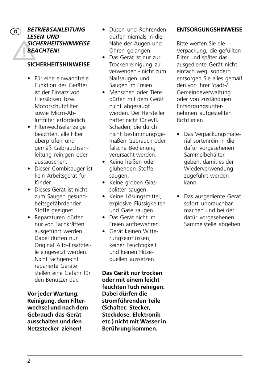 BETRIEBSANLEITUNG LESEN UND SICHERHEITSHINWEISE BEACHTEN! SICHERHEITSHINWEISE • Für eine einwandfreie Funktion des Gerätes ist der Einsatz von Filersäcken, bzw. Motorschutzfilter, sowie Micro-Abluftfilter erforderlich. • Filterwechselanzeige beachten, alle Filter überprüfen und gemäß Gebrauchsanleitung reinigen oder austauschen. • Dieser Combisauger ist kein Arbeitsgerät für Kinder. • Dieses Gerät ist nicht zum Saugen gesundheitsgefährdender Stoffe geeignet. • Reparaturen dürfen nur von Fachkräften ausgeführt werden. Dabei dürfen nur Original Alto-Ersatzteile eingesetzt werden. Nicht fachgerecht reparierte Geräte stellen eine Gefahr für den Benutzer dar. Vor jeder Wartung, Reinigung, dem Filterwechsel und nach dem Gebrauch das Gerät ausschalten und den Netzstecker ziehen!