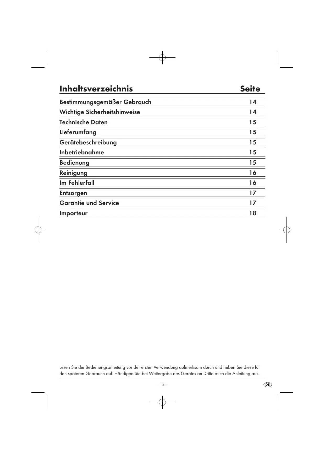 Lesen Sie die Bedienungsanleitung vor der ersten Verwendung aufmerksam durch und heben Sie diese für den späteren Gebrauch auf. Händigen Sie bei Weitergabe des Gerätes an Dritte auch die Anleitung aus. - 13 -