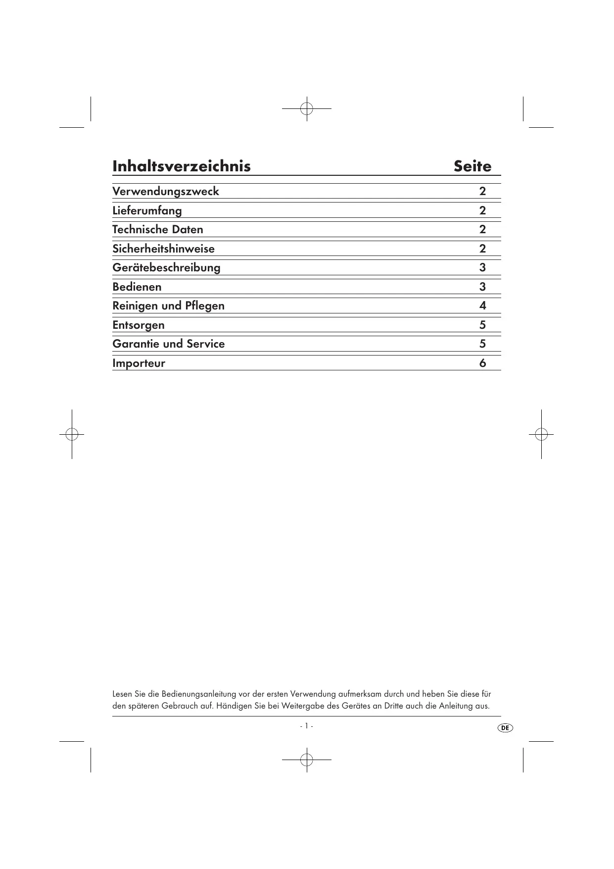 Lesen Sie die Bedienungsanleitung vor der ersten Verwendung aufmerksam durch und heben Sie diese für den späteren Gebrauch auf. Händigen Sie bei Weitergabe des Gerätes an Dritte auch die Anleitung aus. -1-