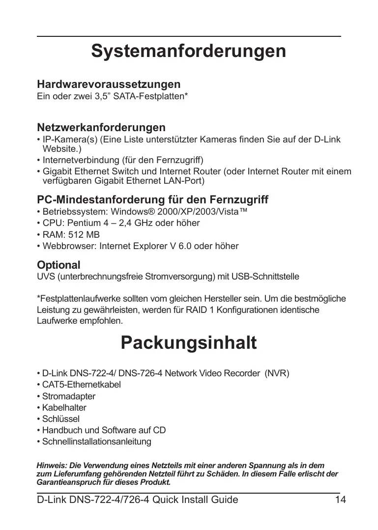 - Schnellinstallationsanleitung Hinweis: Die Verwendung eines Netzteils mit einer anderen Spannung als in dem zum Lieferumfang gehörenden Netzteil führt zu Schäden. In diesem Falle erlischt der Garantieanspruch für dieses Produkt. D-Link DNS-722-4/726-4 Quick Install Guide