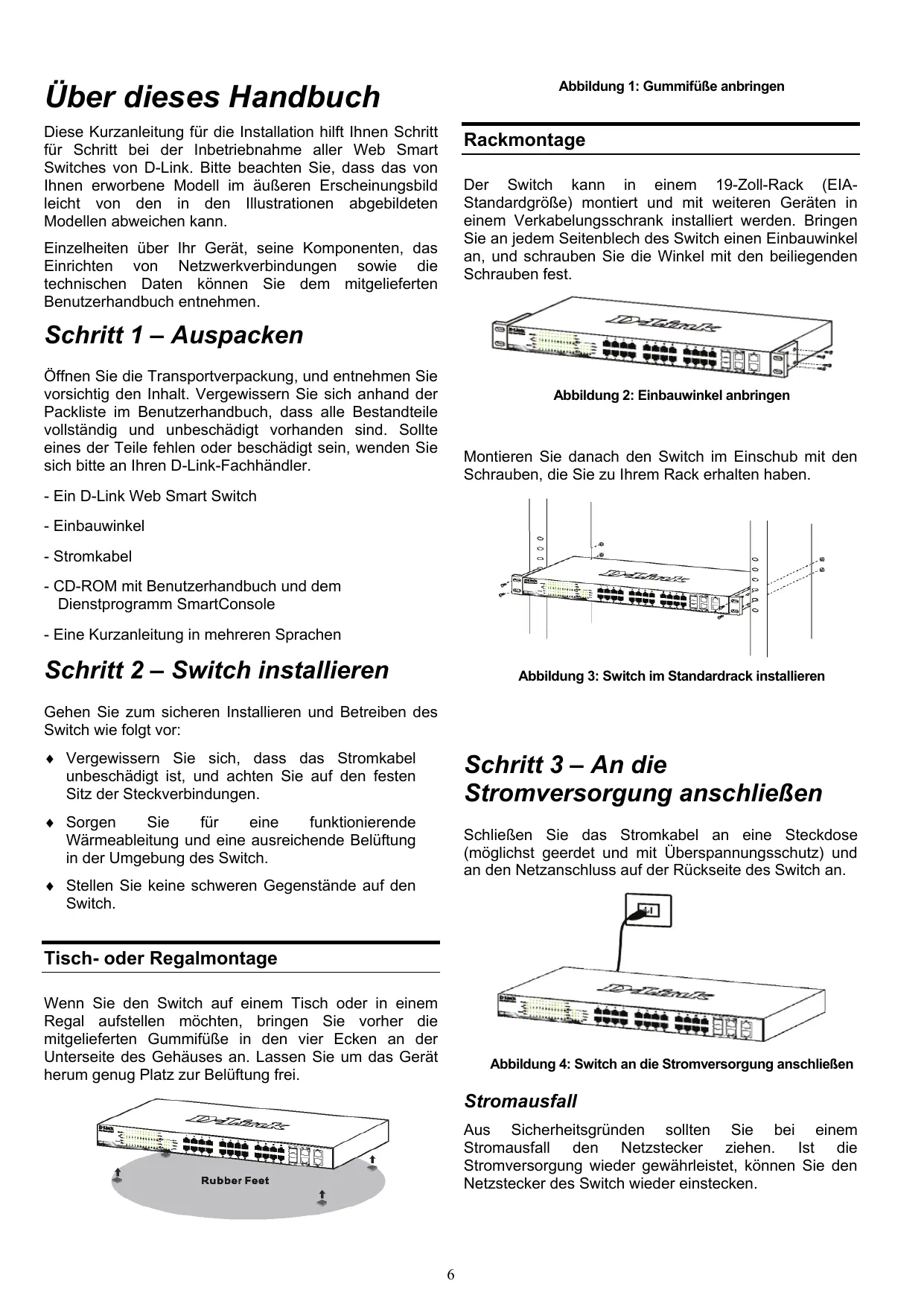 These Kurzanleitung für die Installation hilft Ihnen Schritt für Schritt bei der Inbetriebnahme aller Web Smart Switches von D-Link.itte beachten Sie, dass das von Ihnen erworbene Modell im außeren Erscheinungsbild liegt von den in den Illustrationen abgebildeten Modellen abweichen kann.