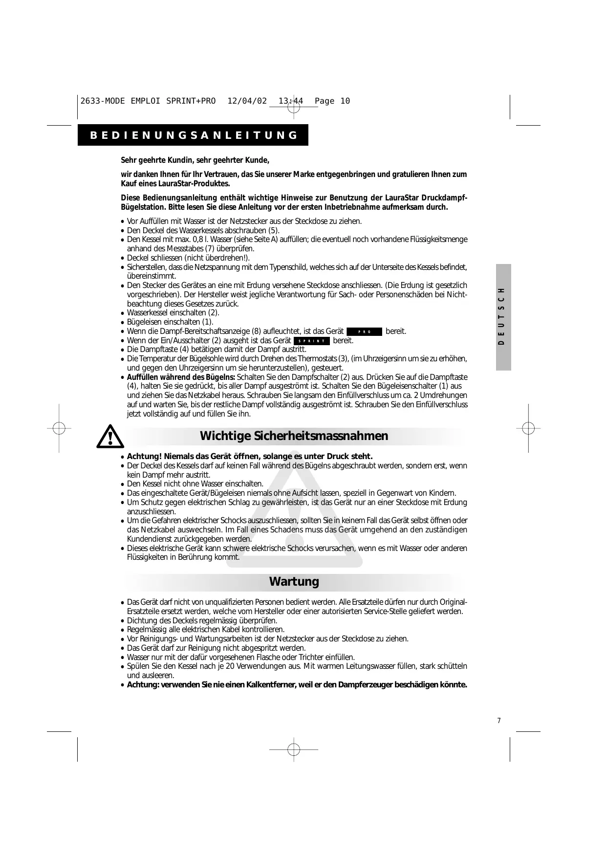 PRO SPRINT - Dampfbügeleisen LAURASTAR - Kostenlose Bedienungsanleitung