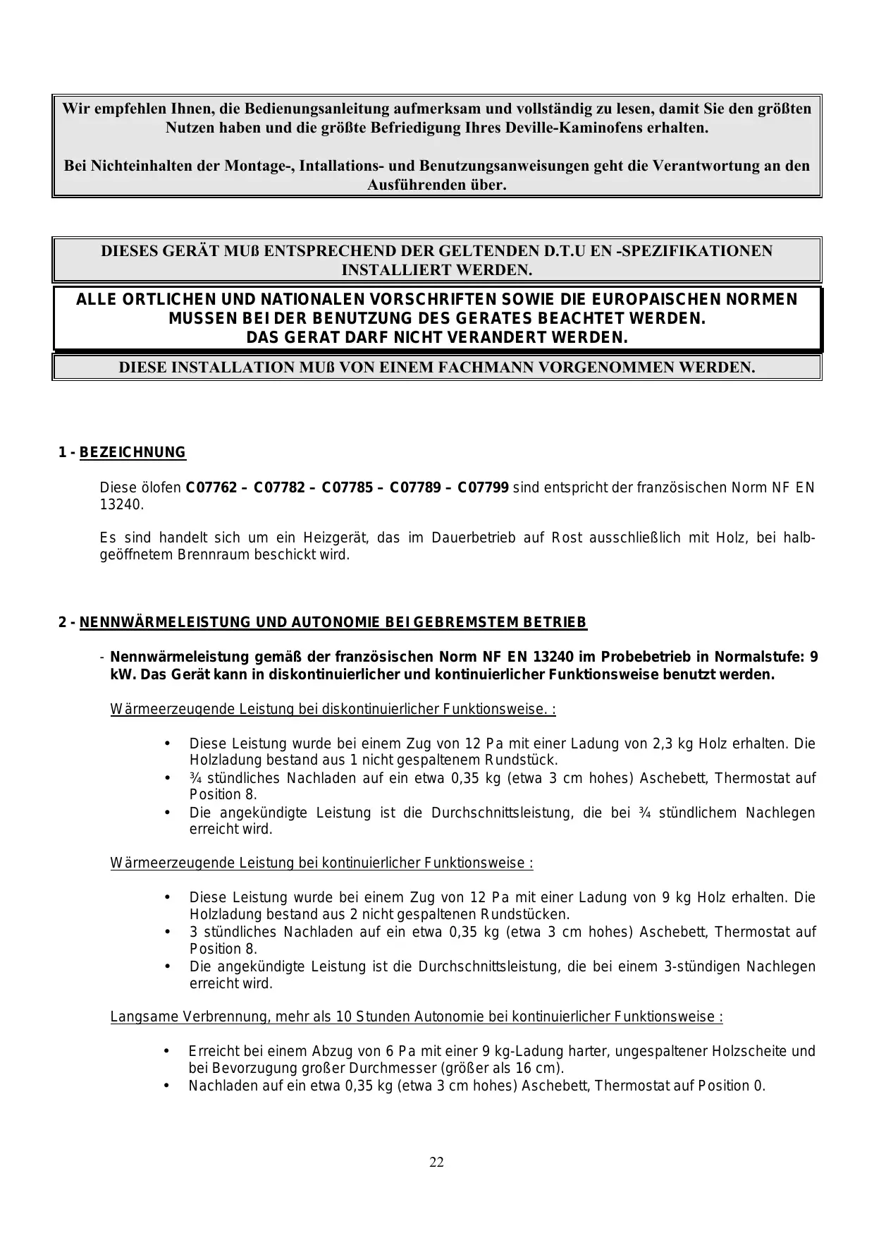 Wir empfehlen Ihnen, die Bedienungsanleitung aufmerksam und vollständig zu lesen, damit Sie den größten Nutzen haben und die größte Befriedigung Ihres Deville-Kaminofens erhalten. Bei Nichteinhalten der Montage-, Intallations- und Benutzungsanweisungen geht die Verantwortung an den Ausführenden über. DIESES GERÄT MUß ENTSPRECHEND DER GELTENDEN D.T.U EN -SPEZIFIKATIONEN INSTALLIERT WERDEN. ALLE ORTLICHEN UND NATIONALEN VORSCHRIFTEN SOWIE DIE EUROPAISCHEN NORMEN MUSSEN BEI DER BENUTZUNG DES GERATES BEACHTET WERDEN. DAS GERAT DARF NICHT VERANDERT WERDEN. DIESE INSTALLATION MUß VON EINEM FACHMANN VORGENOMMEN WERDEN.