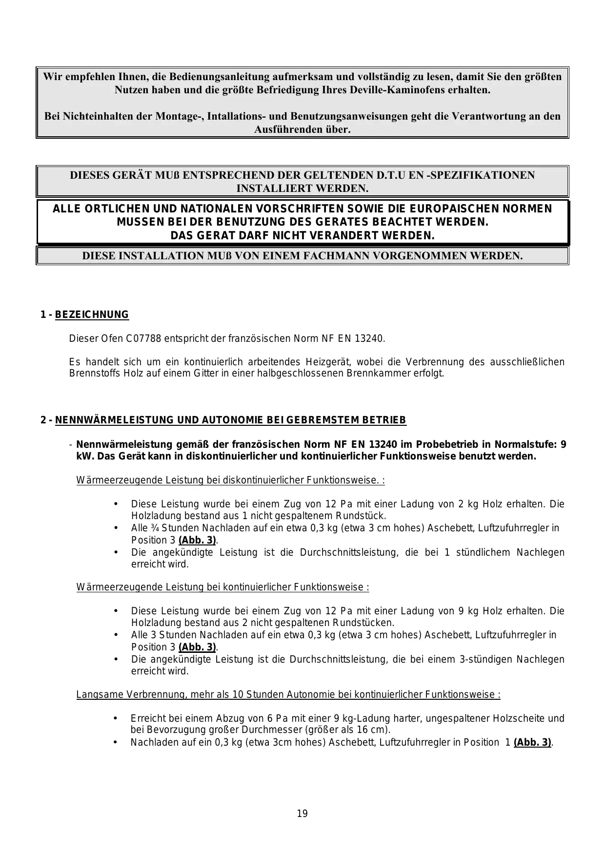 Wir empfehlen Ihnen, die Bedienungsanleitung aufmerksam und vollständig zu lesen, damit Sie den größten Nutzen haben und die größte Befriedigung Ihres Deville-Kaminofens erhalten. Bei Nichteinhalten der Montage-, Intallations- und Benutzungsanweisungen geht die Verantwortung an den Ausführenden über. DIESES GERÄT MUß ENTSPRECHEND DER GELTENDEN D.T.U EN -SPEZIFIKATIONEN INSTALLIERT WERDEN. ALLE ORTLICHEN UND NATIONALEN VORSCHRIFTEN SOWIE DIE EUROPAISCHEN NORMEN MUSSEN BEI DER BENUTZUNG DES GERATES BEACHTET WERDEN. DAS GERAT DARF NICHT VERANDERT WERDEN. DIESE INSTALLATION MUß VON EINEM FACHMANN VORGENOMMEN WERDEN.