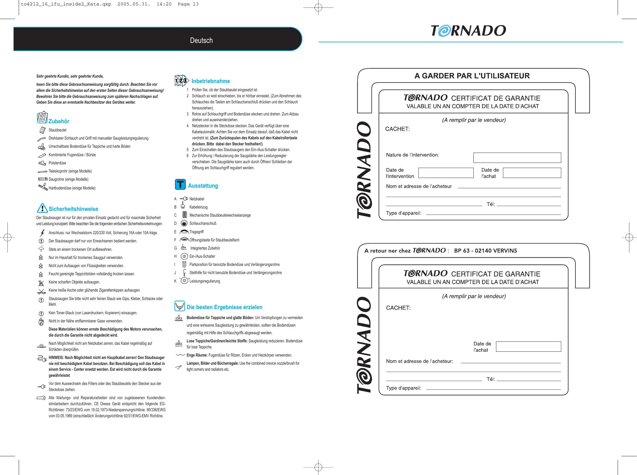 Leistungsregulierung Der Staubsauger ist nur für den privaten Einsatz gedacht und für maximale Sicherheit und Leistung konzipiert. Bitte beachten Sie die folgenden einfachen Sicherheitsvorkehrungen: Keine heiße Asche oder glühende Zigarettenkippen aufsaugen. Staubsaugen Sie bitte nicht sehr feinen Staub wie Gips, Kleber, Schlacke oder Mehl. Kein Toner-Staub (von Laserdruckern, Kopierern) einsaugen. Nicht in der Nähe entflammbarer Gase verwenden. Diese Materialien können ernste Beschädigung des Motors verursachen, die durch die Garantie nicht abgedeckt wird. Nach Möglichkeit nicht am Netzkabel zerren; das Kabel regelmäßig auf Schäden überprüfen. HINWEIS: Nach Möglichkeit nicht am Hauptkabel zerren! Den Staubsauger nie mit beschädigtem Kabel benutzen. Bei Beschädigung soll das Kabel in einem Service - Center ersetzt werden. Est wird nicht durch die Garantie gewährleistet. Vor dem Auswechseln des Filters oder des Staubbeutels den Stecker aus der Steckdose ziehen. Alle Wartungs- und Reparaturarbeiten sind von zugelassenen Kundendienstmitarbeitern durchzuführen. CE Dieses Gerät entspricht den folgende EGRichtlinien: 73/23/EWG vom 19.02.1973-Niederspannungrichtlinie. 89/336/EWG vom 03.05.1989 (einschließlich Änderungsrichtlinie 92/31/EWG-EMV Richtline. Die besten Ergebnisse erzielen Bodendüse für Teppiche und glatte Böden: Um Verstopfungen zu vermeiden und eine wirksame Saugleistung zu gewährleisten, sollten die Bodendüsen regelmäßig mit Hilfe des Schlauchgriffs abgesaugt werden. Lose Teppiche/Gardinen/leichte Stoffe: Saugleistung reduzieren. Bodendüse für lose Teppiche. Enge Räume: Fugendüse für Ritzen, Ecken und Heizkörper verwenden. Lampen, Bilder und Bücherregale: Use the combined crevice nozzle/brush for tight corners and radiators etc. to4212_16_ifu_inside2_Kata.qxp