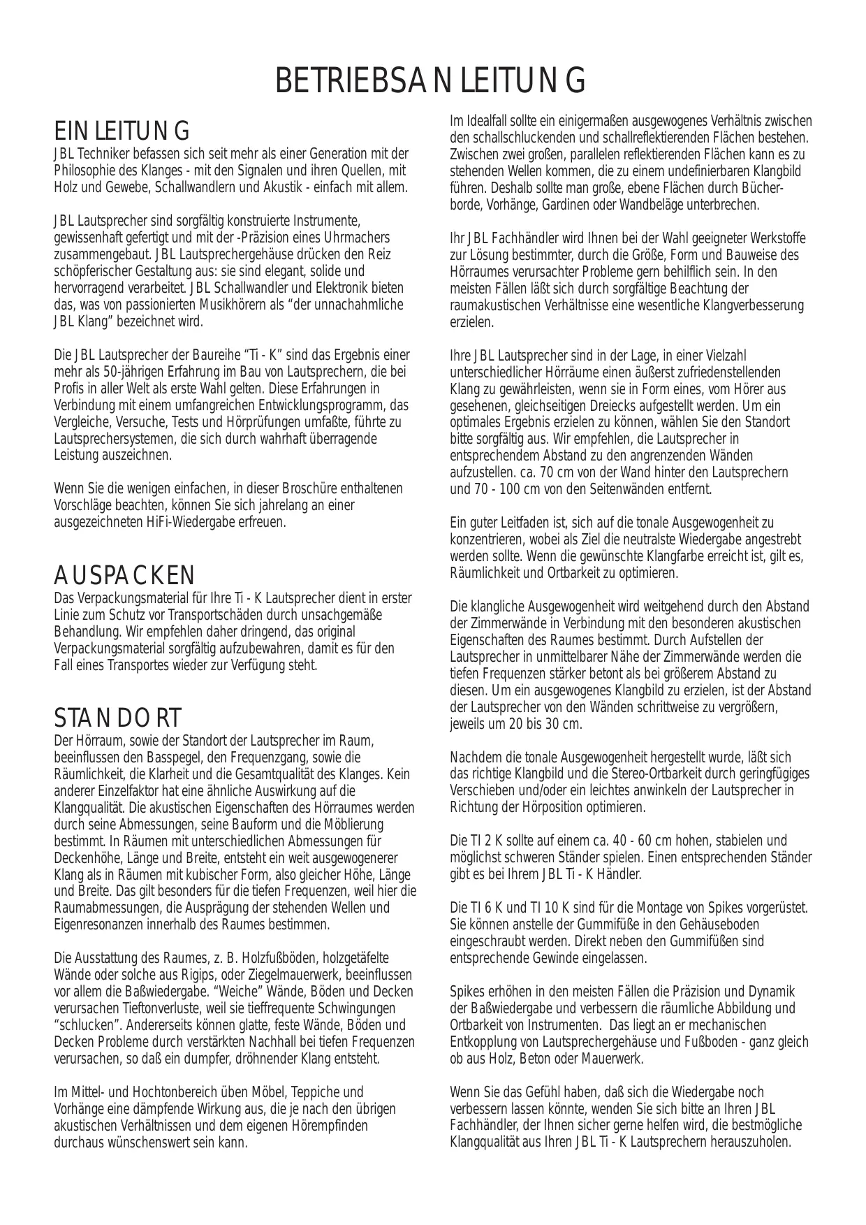 082-1/3.1995 EN 55 022/5. 1995 EN 60 065. 1993 EN 60 555 Part 2/4. 1987 Steen Michaelsen JBL Europe A/S Birkerød. DENMARK.1/99 06/98 Birkerød DENMARK BETRIEBSANLEITUNG EINLEITUNG JBL Techniker befassen sich seit mehr als einer Generation mit der Philosophie des Klanges - mit den Signalen und ihren Quellen, mit Holz und Gewebe, Schallwandlern und Akustik - einfach mit allem. JBL Lautsprecher sind sorgfältig konstruierte Instrumente, gewissenhaft gefertigt und mit der -Präzision eines Uhrmachers zusammengebaut. JBL Lautsprechergehäuse drücken den Reiz schöpferischer Gestaltung aus: sie sind elegant, solide und hervorragend verarbeitet. JBL Schallwandler und Elektronik bieten das, was von passionierten Musikhörern als “der unnachahmliche JBL Klang” bezeichnet wird. Die JBL Lautsprecher der Baureihe “Ti - K” sind das Ergebnis einer mehr als 50-jährigen Erfahrung im Bau von Lautsprechern, die bei Profis in aller Welt als erste Wahl gelten. Diese Erfahrungen in Verbindung mit einem umfangreichen Entwicklungsprogramm, das Vergleiche, Versuche, Tests und Hörprüfungen umfaßte, führte zu Lautsprechersystemen, die sich durch wahrhaft überragende Leistung auszeichnen. Wenn Sie die wenigen einfachen, in dieser Broschüre enthaltenen Vorschläge beachten, können Sie sich jahrelang an einer ausgezeichneten HiFi-Wiedergabe erfreuen. AUSPACKEN Das Verpackungsmaterial für Ihre Ti - K Lautsprecher dient in erster Linie zum Schutz vor Transportschäden durch unsachgemäße Behandlung. Wir empfehlen daher dringend, das original Verpackungsmaterial sorgfältig aufzubewahren, damit es für den Fall eines Transportes wieder zur Verfügung steht. STANDORT Der Hörraum, sowie der Standort der Lautsprecher im Raum, beeinflussen den Basspegel, den Frequenzgang, sowie die Räumlichkeit, die Klarheit und die Gesamtqualität des Klanges. Kein anderer Einzelfaktor hat eine ähnliche Auswirkung auf die Klangqualität. Die akustischen Eigenschaften des Hörraumes werden durch seine Abmessungen, seine Bauform und die Möblierung bestimmt. In Räumen mit unterschiedlichen Abmessungen für Deckenhöhe, Länge und Breite, entsteht ein weit ausgewogenerer Klang als in Räumen mit kubischer Form, also gleicher Höhe, Länge und Breite. Das gilt besonders für die tiefen Frequenzen, weil hier die Raumabmessungen, die Ausprägung der stehenden Wellen und Eigenresonanzen innerhalb des Raumes bestimmen. Die Ausstattung des Raumes, z. B. Holzfußböden, holzgetäfelte Wände oder solche aus Rigips, oder Ziegelmauerwerk, beeinflussen vor allem die Baßwiedergabe. “Weiche” Wände, Böden und Decken verursachen Tieftonverluste, weil sie tieffrequente Schwingungen “schlucken”. Andererseits können glatte, feste Wände, Böden und Decken Probleme durch verstärkten Nachhall bei tiefen Frequenzen verursachen, so daß ein dumpfer, dröhnender Klang entsteht. Im Mittel- und Hochtonbereich üben Möbel, Teppiche und Vorhänge eine dämpfende Wirkung aus, die je nach den übrigen akustischen Verhältnissen und dem eigenen Hörempfinden durchaus wünschenswert sein kann. Im Idealfall sollte ein einigermaßen ausgewogenes Verhältnis zwischen den schallschluckenden und schallreflektierenden Flächen bestehen. Zwischen zwei großen, parallelen reflektierenden Flächen kann es zu stehenden Wellen kommen, die zu einem undefinierbaren Klangbild führen. Deshalb sollte man große, ebene Flächen durch Bücherborde, Vorhänge, Gardinen oder Wandbeläge unterbrechen. Ihr JBL Fachhändler wird Ihnen bei der Wahl geeigneter Werkstoffe zur Lösung bestimmter, durch die Größe, Form und Bauweise des Hörraumes verursachter Probleme gern behilflich sein. In den meisten Fällen läßt sich durch sorgfältige Beachtung der raumakustischen Verhältnisse eine wesentliche Klangverbesserung erzielen. Ihre JBL Lautsprecher sind in der Lage, in einer Vielzahl unterschiedlicher Hörräume einen äußerst zufriedenstellenden Klang zu gewährleisten, wenn sie in Form eines, vom Hörer aus gesehenen, gleichseitigen Dreiecks aufgestellt werden. Um ein optimales Ergebnis erzielen zu können, wählen Sie den Standort bitte sorgfältig aus. Wir empfehlen, die Lautsprecher in entsprechendem Abstand zu den angrenzenden Wänden aufzustellen. ca. 70 cm von der Wand hinter den Lautsprechern und 70 - 100 cm von den Seitenwänden entfernt. Ein guter Leitfaden ist, sich auf die tonale Ausgewogenheit zu konzentrieren, wobei als Ziel die neutralste Wiedergabe angestrebt werden sollte. Wenn die gewünschte Klangfarbe erreicht ist, gilt es, Räumlichkeit und Ortbarkeit zu optimieren. Die klangliche Ausgewogenheit wird weitgehend durch den Abstand der Zimmerwände in Verbindung mit den besonderen akustischen Eigenschaften des Raumes bestimmt. Durch Aufstellen der Lautsprecher in unmittelbarer Nähe der Zimmerwände werden die tiefen Frequenzen stärker betont als bei größerem Abstand zu diesen. Um ein ausgewogenes Klangbild zu erzielen, ist der Abstand der Lautsprecher von den Wänden schrittweise zu vergrößern, jeweils um 20 bis 30 cm. Nachdem die tonale Ausgewogenheit hergestellt wurde, läßt sich das richtige Klangbild und die Stereo-Ortbarkeit durch geringfügiges Verschieben und/oder ein leichtes anwinkeln der Lautsprecher in Richtung der Hörposition optimieren. Die TI 2 K sollte auf einem ca. 40 - 60 cm hohen, stabielen und möglichst schweren Ständer spielen. Einen entsprechenden Ständer gibt es bei Ihrem JBL Ti - K Händler. Die TI 6 K und TI 10 K sind für die Montage von Spikes vorgerüstet. Sie können anstelle der Gummifüße in den Gehäuseboden eingeschraubt werden. Direkt neben den Gummifüßen sind entsprechende Gewinde eingelassen. Spikes erhöhen in den meisten Fällen die Präzision und Dynamik der Baßwiedergabe und verbessern die räumliche Abbildung und Ortbarkeit von Instrumenten. Das liegt an er mechanischen Entkopplung von Lautsprechergehäuse und Fußboden - ganz gleich ob aus Holz, Beton oder Mauerwerk. Wenn Sie das 