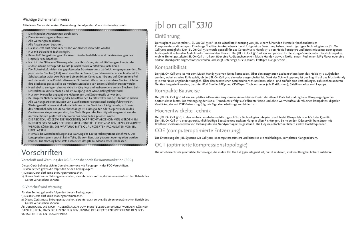Die folgenden Anweisungen durchlesen. Diese Anweisungen aufbewahren. Alle Warnungen beachten. Alle Anweisungen beachten. Dieses Gerät darf nicht in der Nähe von Wasser verwendet werden. Nur mit trockenem Tuch reinigen. Keine Belüftungsöffnungen blockieren. Bei der Installation sind die Anweisungen des Herstellers zu beachten. Nicht in der Nähe von Wärmequellen wie Heizkörper, Warmluftöffnungen, Herde oder andere Wärme erzeugende Geräte (einschließlich Verstärkern) installieren. Die Sicherheitsfunktion des gepolten oder Schukosteckers darf nicht umgangen werden. Ein polarisierter Stecker (USA) weist zwei flache Pole auf, von denen einer etwas breiter ist. Ein Schukostecker weist zwei Pole und einen dritten Kontakt zur Erdung auf. Der breitere Pol und der zusätzliche Kontakt dienen der Sicherheit. Wenn der vorhandene Stecker nicht in Ihre Steckdose passt, sollte die veraltete Steckdose von einem Elektriker ersetzt werden. Netzkabel so verlegen, dass es nicht im Weg liegt und insbesondere an den Steckern, beim Einstecken in Verteilerdosen und am Ausgang vom Gerät nicht geknickt wird. Nur vom Hersteller angegebene Halterungen und Zubehörteile verwenden. Bei längerer Nichtbenutzung oder Gewittern den Gerätestecker aus der Steckdose ziehen. Alle Wartungsarbeiten müssen von qualifiziertem Fachpersonal durchgeführt werden. Wartungsmaßnahmen sind erforderlich, wenn das Gerät beschädigt wurde, z. B. wenn das Netzkabel oder der Stecker beschädigt ist, Flüssigkeiten oder Gegenstände in das Geräteinnere eingedrungen sind, das Gerät Regen oder Feuchtigkeit ausgesetzt war, der normale Betrieb gestört ist oder wenn das Gerät fallen gelassen wurde. DIE ABDECKUNG (BZW. DIE RÜCKSEITE) DARF NICHT ABGENOMMEN WERDEN. IM INNEREN DES GERÄTS BEFINDEN SICH KEINE TEILE, DIE VOM BENUTZER GEWARTET WERDEN KÖNNEN. DIE WARTUNG BITTE QUALIFIZIERTEN FACHLEUTEN VON JBL ÜBERLASSEN. Niemals die Gitterabdeckungen zur Wartung des Lautsprechersystems abnehmen. Das Lautsprechersystem enthält keine Teile, die vom Benutzer gewartet oder repariert werden können. Die Wartung bitte stets Fachleuten des JBL-Kundendienstes überlassen. Vorschriften jbl on call™5310 Einführung Der tragbare Lautsprecher „JBL On Call 5310“ ist die aktuellste Neuerung von JBL, einem führenden Hersteller hochqualitativer Komponentenaudioanlagen. Eine lange Tradition im Audiobereich und fortgesetzte Forschung haben die einzigartigen Technologien im JBL On Call 5310 ermöglicht. Der JBL On Call 5310 wurde speziell für das XpressMusic-Handy 5310 von Nokia konzipiert und bietet mit seiner überlegenen Audioqualität optimalen Audiokomfort im mobilen Bereich. Der JBL On Call 5310 ist ein kompaktes Hochleistungs-Soundcenter. Der als kompakte, mobile Einheit gestaltete JBL On Call 5310 kann über eine Audiobuchse an ein Musik-Handy 5310 von Nokia, einen iPod, einen MP3-Player oder eine andere Musikquelle angeschlossen werden und sorgt unterwegs für ein reines, kräftiges Klangerlebnis. Kompatibilität Der JBL On Call 5310 ist mit dem Musik-Handy 5310 von Nokia kompatibel. Über den integrierten Ladeanschluss kann das Nokia 5310 aufgeladen werden, wobei es keine Rolle spielt, ob der JBL On Call 5310 ein- oder ausgeschaltet ist. Dank der Schnellkupplung ist der Zugriff auf das Musik-Handy 5310 von Nokia ungehindert möglich. Über den zusätzlichen Stereominianschluss kann schnell und einfach eine Verbindung zu zahlreichen anderen Geräten hergestellt werden, darunter iPod Shuffle, MP3- und CD-Player, Tischcomputer (alle Plattformen), Satellitenradios und Laptops. Kompakte Bauweise Der JBL On Call 5310 ist ein komplettes 2-Kanal-Audiosystem in einem kleinen Gerät, das überall Platz hat und digitales Klangvergnügen der Spitzenklasse bietet. Die Versorgung der Radial-Transducer erfolgt auf effiziente Weise und ohne Wärmeaufbau durch einen kompakten, digitalen Verstärker, der mit DSP-Entzerrung (digitale Signalverarbeitung) kombiniert ist. Hochentwickelte Technik Der JBL On Call 5310, in den zahlreiche urheberrechtlich geschützte Technologien integriert sind, bietet Klangerlebnisse höchster Qualität. Der JBL On Call 5310 erzeugt erstaunlich kräftige Basstöne und exakten Klang in allen Richtungen. Seine beiden Odyssey®-Transducer mit Breitbandspektrum werden von leistungsstarken Neodymmagneten gesteuert. Die Odyssey-Hochtöner liefern exakte Hochfrequenzen. COE (computeroptimierte Entzerrung) Die Entzerrung des JBL-Systems On Call 5310 ist computeroptimiert und bietet so ein reichhaltiges, komplettes Klangspektrum. OCT (optimierte Kompressionstopologie) Die urheberrechtlich geschützte Technologie, die in den JBL On Call 5310 integriert ist, bietet sauberen, exakten Klang bei hoher Lautstärke. Vorschrift und Warnung der US-Bundesbehörde für Kommunikation (FCC) Dieses Gerät befindet sich in Übereinstimmung mit Paragraph 15 der FCC-Vorschriften. Für den Betrieb gelten die folgenden beiden Bedingungen: